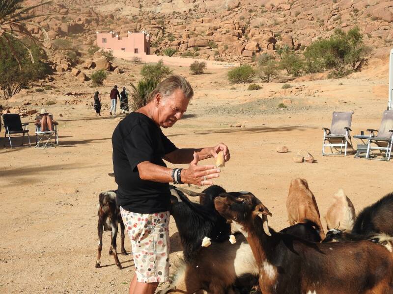 We hebben de indruk dat het minder druk is geweest met campers in Tafraout dan andere jaren. Bij navraag bij de gardien blijkt dat schijn bedriegt, er stonden vrijdag maar liefst 312 campers. Wel waren er dit jaar minder Fransen en meer Engelsen, Duitsers en er zijn redelijk wat Nederlanders. Ook staan er veel campers bij het dorp Tazka in de palmentuin, dat zijn er wellicht ook een stuk of 100. Verder zijn de 3 campings hier bij het dorp redelijk bezet, de andere campings iets ten noorden van het dorp, daar staan heel weinig campers, die liggen wat verder van Tafraout.