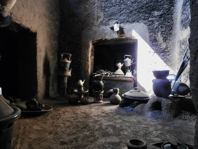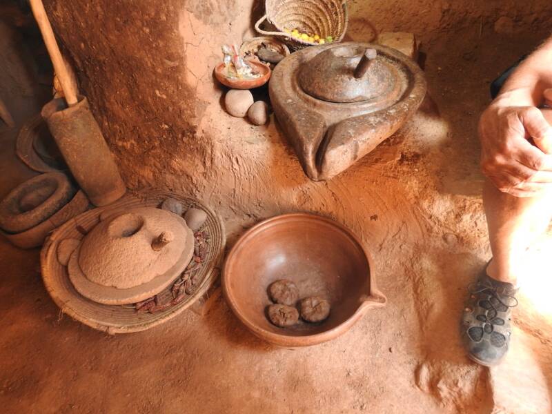 Naast de deur links twee emmertjes van geitenhuid om water uit de put te halen