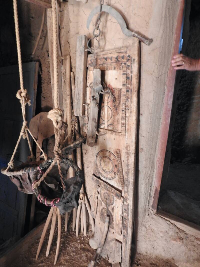 Hierna nam de man de rondleiding over. Boven woonden de mensen, soms wel 3 generaties bij elkaar. Zij woonden boven de stallen en profiteerden ’s winters van de warmte van het vee. De keuken nam een centrale plek in op de bovenverdieping waar ook geslapen en gegeten werd. In de gezamenlijke eetruimte werd in groepen gegeten omdat er soms wel 30 mensen woonden. Het eten ging in een grote schaal waaruit iedereen dan at met de rechterhand, de linkerhand werd gebruikt om de billen af te vegen. Het afval uit de keuken werd door een gat naar beneden de stallen in gestort. Er was nog een verdieping en die was voor de gasten bestemd. Er was geen toilet, vroeger gingen de vrouwen hun behoeve doen in de stallen, de mannen in het veld. Het huis was al 300 jaar familiebezit. Je moet je maar niet voorstellen hoe dat ’s winters in dat huis geroken moet hebben. We hebben nog gezamenlijk thee gedronken in een ruimte die vol hing met antieke voorwerpen en kleden, dit keer echt antiek. waarbij de gastheer nog even op de banjo speelde. Een zeer geslaagd uitstapje mede omdat de man enthousiast uitleg gaf.