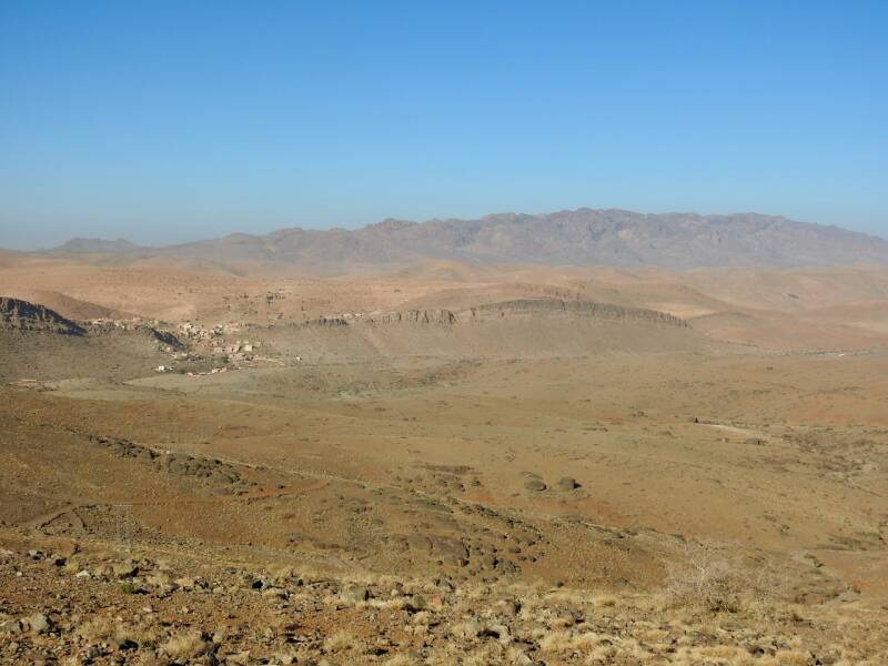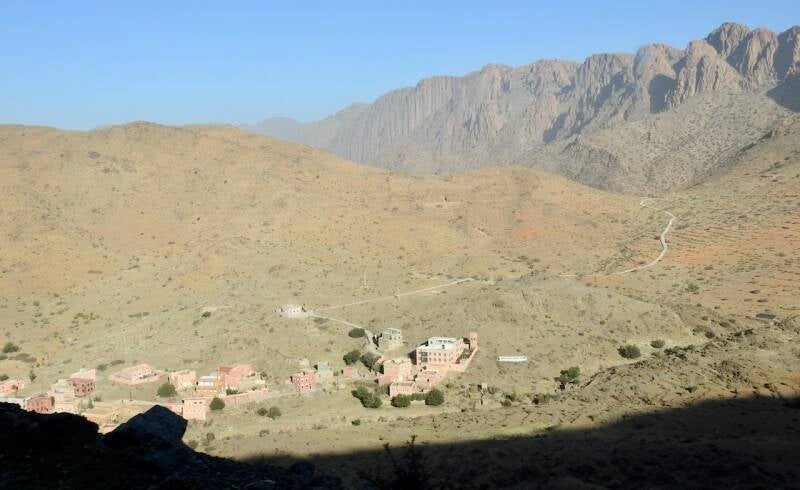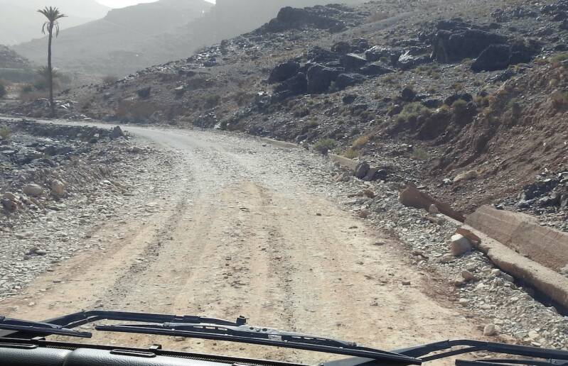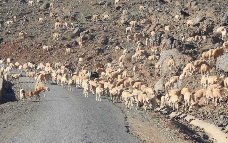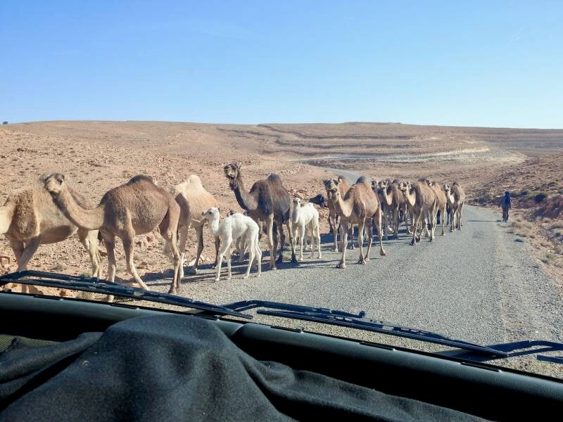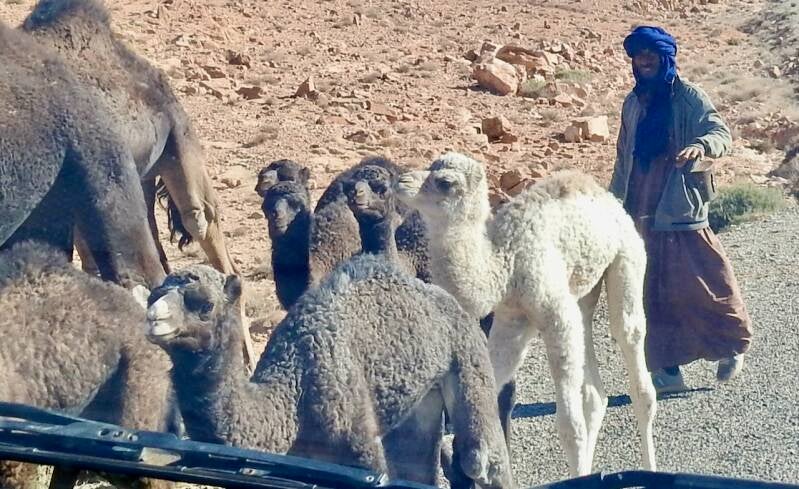 ons tegemoet, daar waren ook wat jonkies bij. Ze passeerden ons rustig, erachter reed een personenauto die ze niet kon passeren maar snel in het gat dook dat wij gecreëerd hadden. We hadden al in de verslagen van Kees/Trui en André/Marjos gelezen dat ze ook 2 kuddes waren tegengekomen op die weg. Bij het dorp Issafen kwamen we op de weg, de N7 ( voormalige R109), van Igherm naar Tata, deze weg is heel goed te rijden, prima wegdek. Normaal is het landschap schitterend met geplooide berghellingen, dat zal het nu ook zijn maar helaas , het was mistig , zodat we er weinig van meekregen, laat staan dat we foto’s konden maken. Nu had Everdien tot we in de mist belanden al 97 foto’s gemaakt, daar doen we het wel mee. En we kunnen altijd nog naar foto’s van andere jaren kijken. Wel kwamen we nog 3 kuddes kamelen tegen die een stuk naast de weg liepen alsmede 2 kuddes zwarte geiten. Wat hebben de amandelbomen ook te lijden onder de droogte. Waren de hellingen van de bergen wit en roze gekleurd doordat ze bezaaid waren met prachtig bloeiende amandelbomen als je van Tafraout naar Igherm reed, nu stonden er slechts enkele in bloei, zo jammer.