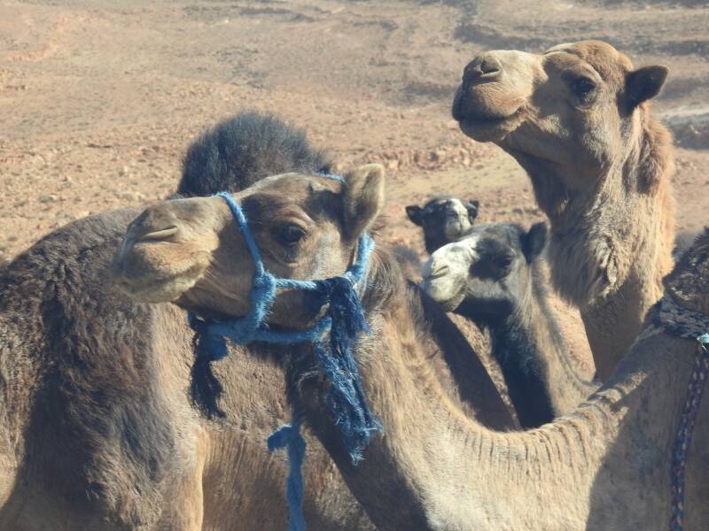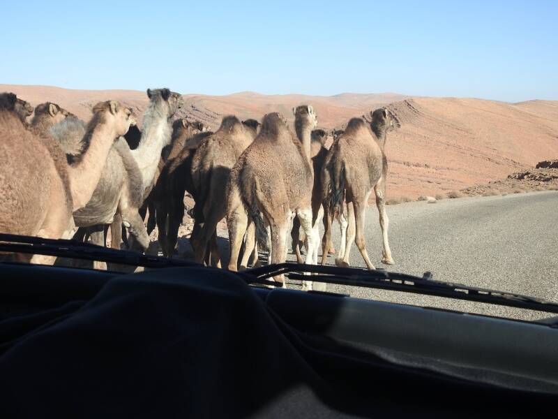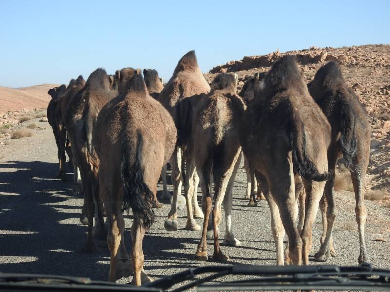 Een kudde kamelen kwam ons tegemoet, die gaan wel aan de kant
