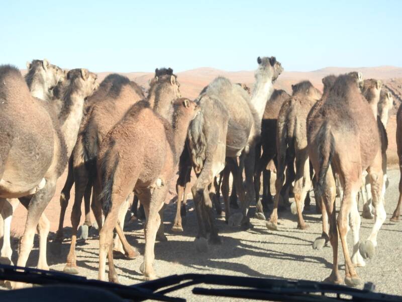 En op de smalle weg kwamen we 2 kuddes kamelen tegen. Een kleine kudde liep van west naar oost over de weg in onze rijrichting en gingen niet aan de kant maar steeds harder hollen tot dat ze na een paar minuten van de weg af gingen. De andere grote kudde kwam