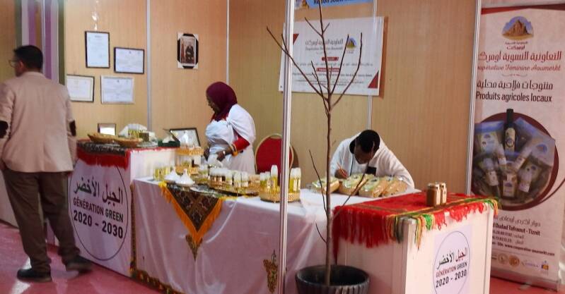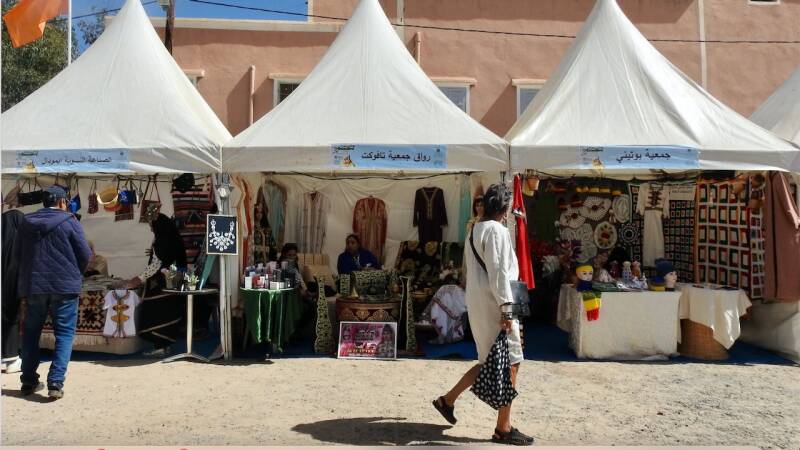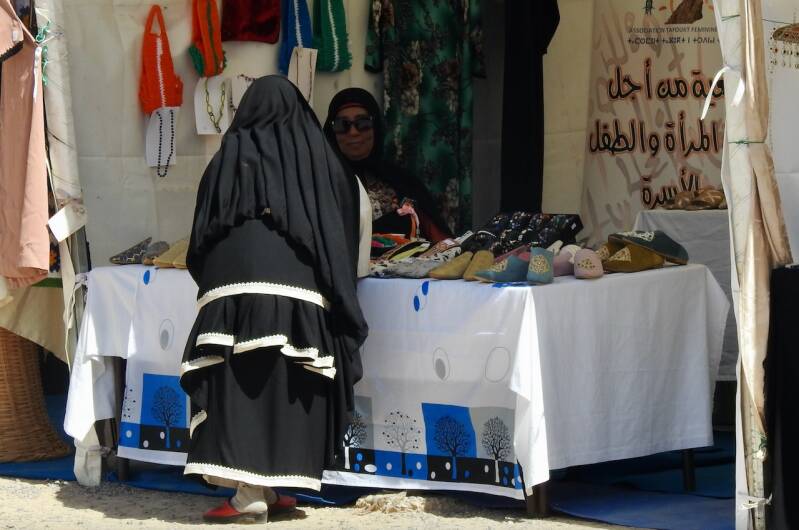 Vanmorgen zijn we naar de slager gegaan en hebben gehakt laten maken van het ‘restvlees’ van de filet pur, dat was wat weinig dus hebben we er een stukje mager rundvlees bij laten malen. Ieder jaar gaan we babouches kopen, deze traditie houden we dit jaar ook in ere. Babouches kun je in heel Marokko koppen, Tafraout staat echter bekend om de productie van die sloffen. We hebben koffie gedronken met Kees en Trui en zijn daarna langs restaurant Étoile du Sud gelopen om voor morgenavond te reserveren. Op de terugweg naar de campers bij de kraampjes op het festivalterrein gelopen, zoals ieder jaar zijn deze bemenst door vrouwen die producten uit de verschillende coöperaties uit de wijde omgeving verkopen. Saffraan uit Talioune , verder vooral argan-, cosmetica- en amandelproducten waaronder amandelolie. Morgen maar eens informeren wat dat kost, we kennen het niet. Vanmiddag bleef de verwachte wind uit ( Weer en Radar zat er naast, Apple app en Weer on Line wel goed) dus was het weer eens goed weer om te borrelen met de Avondrood + groep. Een paar dagen vanwege de harde wind niet gedaan, dus we hebben bijgepraat en gelachen. Als de zon achter de bergen is koelt
