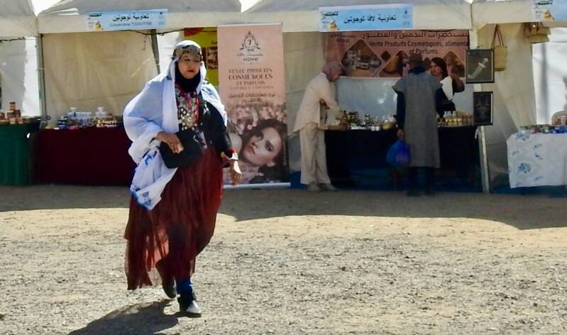 Vanmorgen zijn André en ik bij Mario en Anita bij de camper wezen kijken die gerepareerd en gespoten was door Mohammed. Het zag er mooi uit en ze waren er tevreden over . Wij zijn daarna gaan wandelen naar het dorp Tazka, voor een deel nog helemaal authentiek en sommige huizen zijn in de rotsen gebouwd. Altijd leuk om doorheen te wandelen en het was mooi meegenomen dat we ook nog een diadeemroodstaart konden fotograferen. We zijn via een soort villawijk naar Tafraout gelopen, de wijk was helemaal ommuurd, vorig jaar nog niet. De stam de Ammeln die in Tafraout en omgeving wonen zijn middenstanders en hebben winkels in Marokko en Spanje en elders in Europa. Aan de grote huizen te zien boeren ze goed. We wilden koffie gaan drinken op een terrasje, bleek daar heel toevallig de helft van AR + ook te zitten. Na de koffie zijn we nog even over het festivalterrein gelopen en bij een van de kraampjes in de tent hebben we amandelolie gekocht, dat is nieuw voor ons. Er was nog een wielerwedstrijd geweest in het dorp maar die was net afgelopen.