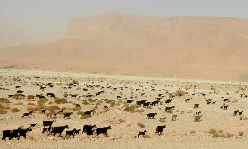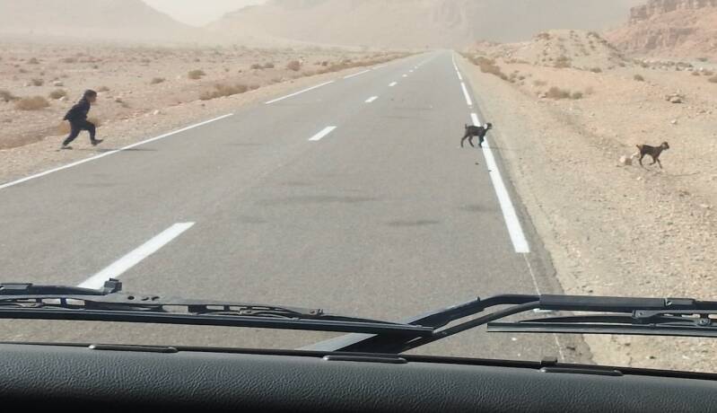 De kudde geiten is al overgestoken, een klein jongetje jaaft de laatste jonge geitjes de weg over