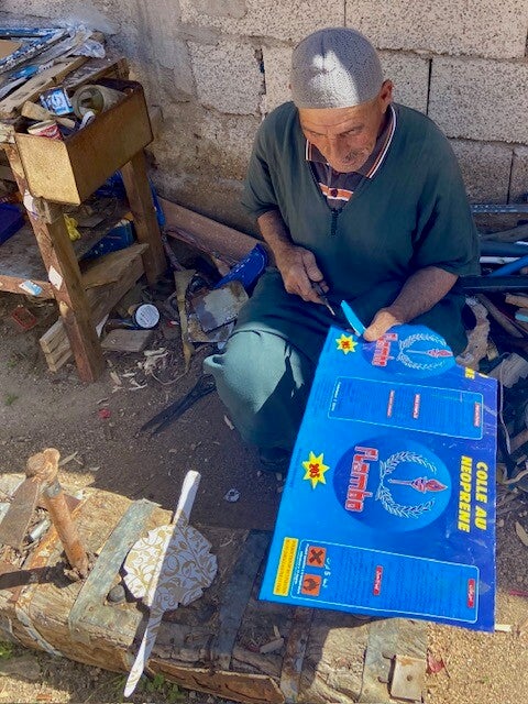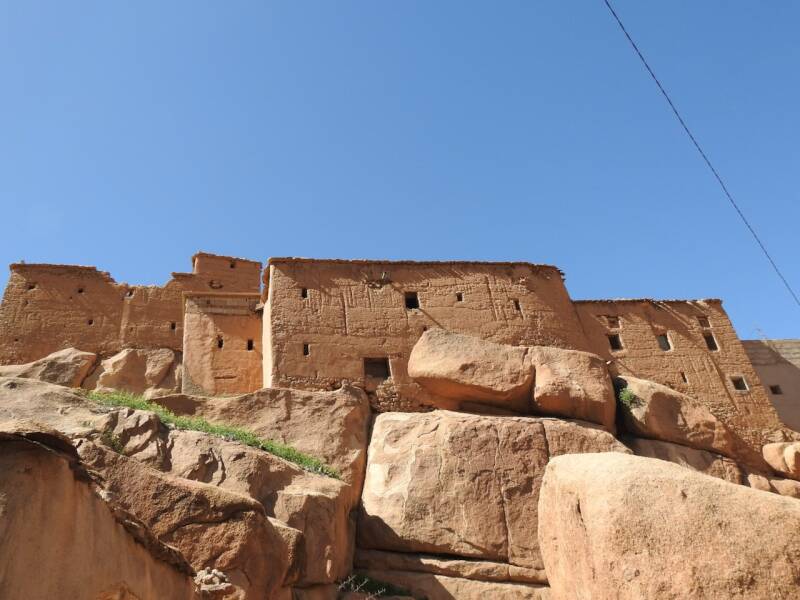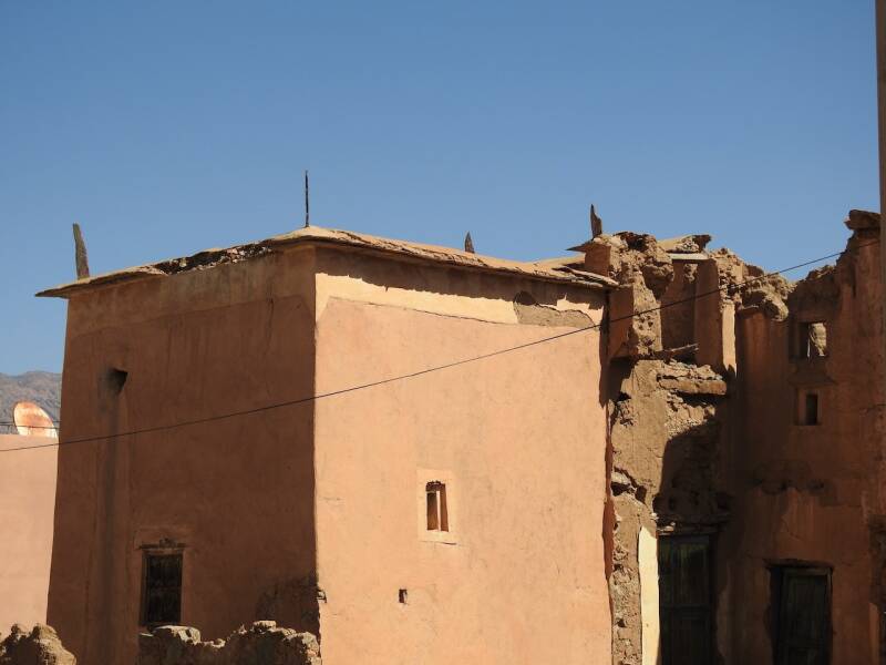 Tazka was een prachtig authentiek dorpje, deels gebouwd in de rotsen , met pisé huizen. Het is nog steeds een mooi dorpje maar veel huizen zijn ingestort, nieuwbouw wordt dan gepleegd met gasbetonblokken waardoor het authentieke karakter langzaam verloren gaat. Het is er heel stil, zeker nu tijdens de ramadan, we hebben genoten om er te wandelen. De enige activiteit was een oudere man die mallen knipte voor motieven op djellaba's. Als ik hem tenminste goed begrepen heb, hij sprak geen FransWel hadden we last van de hitte, we hebben het wel vaker meegemaakt dat het hier boven de 25º was, maar zoals nu, met een aantal dagen op een rij met heel weinig wind, niet eerder wat we ons kunnen herinneren.