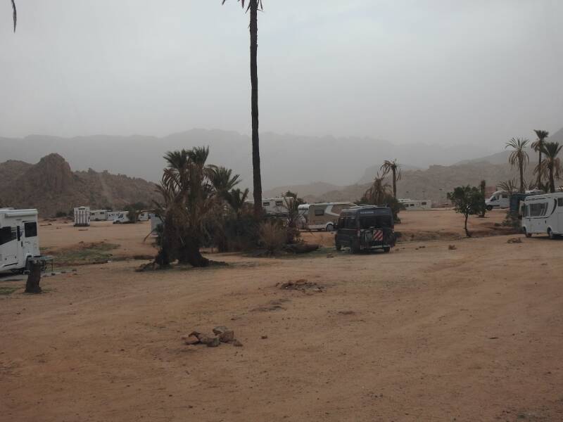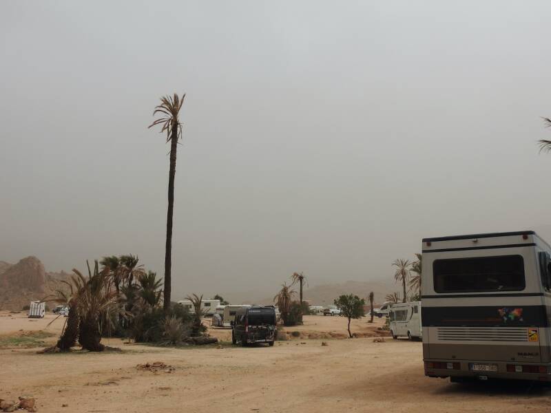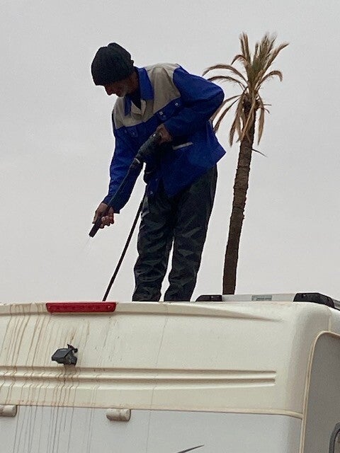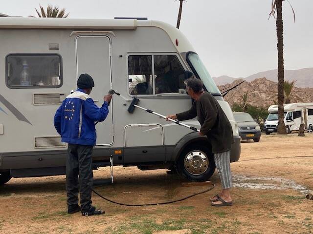 Het was gisterenavond niet alleen aan het stormen maar het begon ook te regenen. Om een uur of 23.00 nam de wind wat af zodat we gelukkig vannacht geen last van de wind hebben gehad. Het zicht was vanmorgen sterk verbeterd, althans als je niet door de ramen probeerde te kijken. Die waren door het effect van het zand en de regen weinig transparant meer. De camper zag er niet uit, vooral niet aan de voor- en aan bestuurderskant waar de wind schuin op had gestaan. Overal was bedrijvigheid op het terrein, er werd gepoetst, geschrobd waarbij zonnepanelen met voorrang werden behandeld. Zowel Pieter als Henk wilden niet dat wij zelf de zonnepanelen gingen schoonmaken en wilden dat voor ons doen, toch hartverwarmend die solidariteit. Henk was al eerste bij de camper om de zonnepanelen schoon te maken, Everdien stofte de camper af zodat hij er weer enigszins toonbaar uitzag.