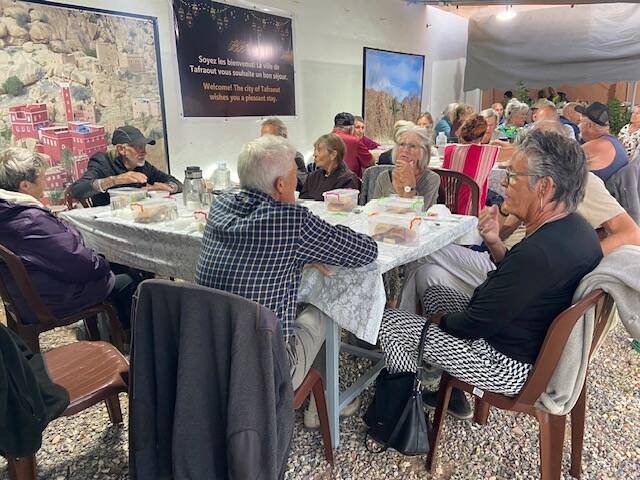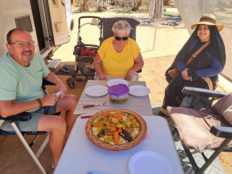 Nu een lekker glas verse jus d’orange weer naar de cp gefietst, daar bleek dat Latifah een grote schaal couscous had gebracht bij de camper van Marjos en André, kennelijk als gebaar van dank dat we er waren wezen eten, leuk van haar. We hebben met z’n allen, minus Trui, die wat verkouden was en Everdien die niet van couscous houdt , er lekker van gegeten..