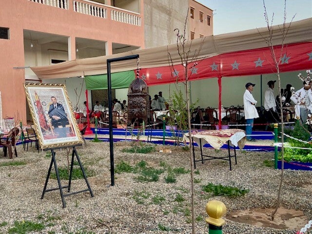 Het misverstand over het eten na zonsondergang, de Iftar is opgelost. We zijn vanavond opnieuw uitgenodigd voor de Iftar, het zal zijn in de tuin van een rijke inwoner van Tafraout, directeur van een grote verffabriek. Deze man heeft kennelijk een zwak hart voor Nederlanders gekregen tijdens de corona periode. Toen waren er een aantal camperaars die niet met de ferry naar Europa konden vanwege de gesloten grenzen. Alle inwoners van Tafraout en de camperaars kregen toen een voedselpakket. Nederlandse camperaars hebben toen een houten bord gemaakt met de tekst erin gebrand: “Dank aan Tafraout, namens de Nederlandse camperaars” of woorden van gelijke strekking.