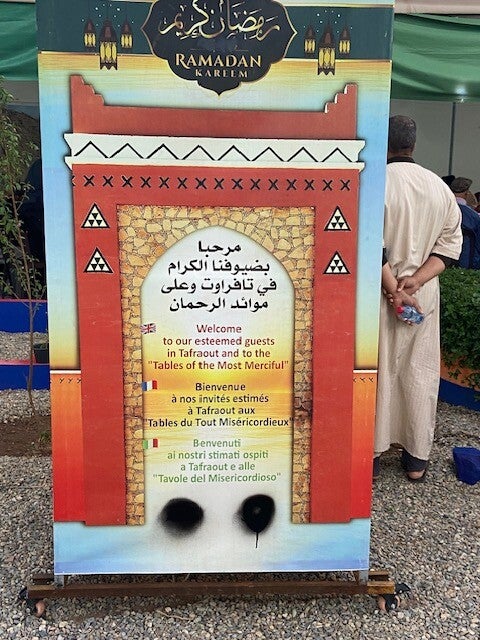 We zaten aan tafels waar al een grote pan met harira stond, bij ieder bord stond een plastic broodtrommeltje gevuld met een croissantje, broodje, hard gekookt ei , puntje smeerkaas, dadels, een mierzoet gebakken soort koekje met sesam zaad waar de honing vanaf droop, dat heet Chebakia. Er was een kan met een onduidelijke drank, w.s. warme melk met wat anijs en nog iets, bijzonder, niet heel erg lekker maar smaken verschillen. De harira was wat flauw maar met het zout en komijn op tafel kon het goed op smaak worden gebracht. Nu moet ik er geen culinaire beschrijving van maken maar het ging er natuurlijk om dat we gezamenlijk de Iftar deelden. Er werd geen teken gegeven wanneer we konden beginnen met eten , de zon was al 5 minuten onder toen de Marokkaanse gasten begonnen te eten en wij het voorbeeld volgden. Na een half uur begonnen de eerste Marokkanen de tafels te verlaten, wij en andere buitenlandse gasten bleven wat langer natafelen. Het was leuk om bij te wonen, het was een wat sobere gebeurtenis maar er werd wel in praktijk gebracht wat de Iftar is , het gezamenlijk eten. En dan ook nog gefinancierd door de weldoener van het dorp, de directeur van de grote Atlas verffabrieken. Op een zuiltje stond de tekst: ‘Welkom aan de tafels van de meest barmhartige.’ (Allah) Het benadrukt liefdadigheid ( sadaqa, een van de vijf zuilen van de islam)) en het gezamenlijk eten verwijst naar de gastvrijheid en zorg voor armen en reizigers . Hoewel de camperaars niet bepaald tot de meer behoeftige reizigers behoren was het een bijzondere ervaring. En heel bijzonder: Everdien heeft harira gegeten!
