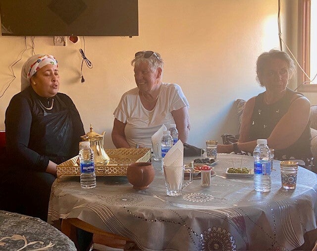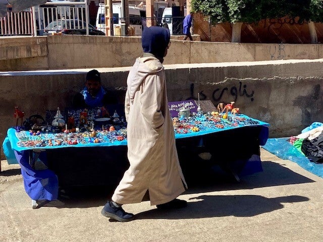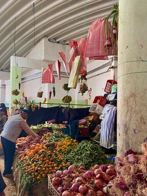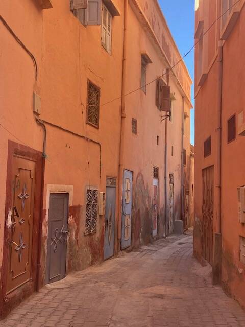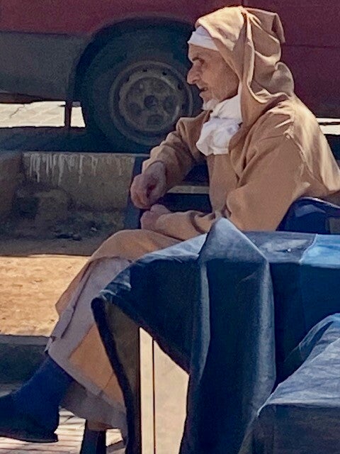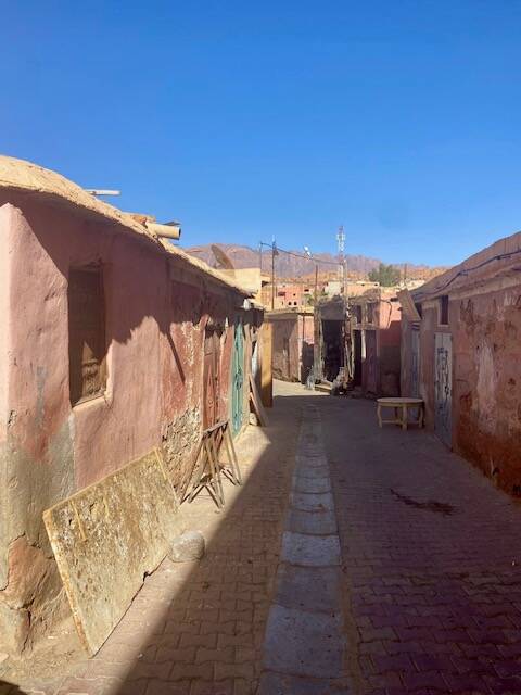 Vanmorgen voor de laatste keer in Tafraout naar de souk geweest, wat fruit en groenten gekocht en bij de overdekte souk kalkoenfilet. Natuurlijk kom je altijd bekenden tegen, en we ontmoeten ook nieuwe mensen. We volgen al een tijdje Bea op Polarsteps , een alleenreizende vrouw. Heel avontuurlijk heeft ze een auto gehuurd hier in Marokko waar ze naar toe gevlogen is en ze rijdt daarmee naar hotels, een naar een soort B en B’s die ze vanuit Nederland geboekt heeft en ze komt zodoende op schilderachtige plekken. Ze is nu in een hotel in Tafarout en liep op de souk met haar nicht die samen met haar man hier in het keteldal staat met de camper.