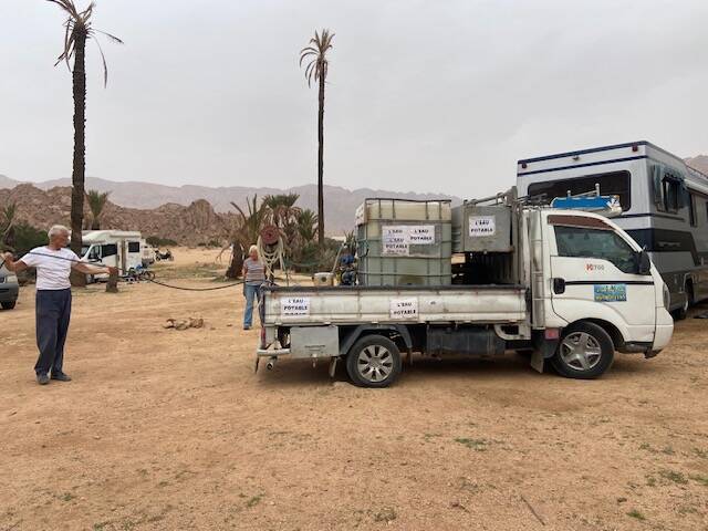 Vanmorgen hebben we de waterwagen laten komen, we hadden nog wel wat water maar toch maar vollaten gooien, ook 5x 5 liter bidons, voorlopig hebben we water genoeg. We douchen nooit maar wassen ons aan de wastafel, zodoende is ons watergebruik laag.