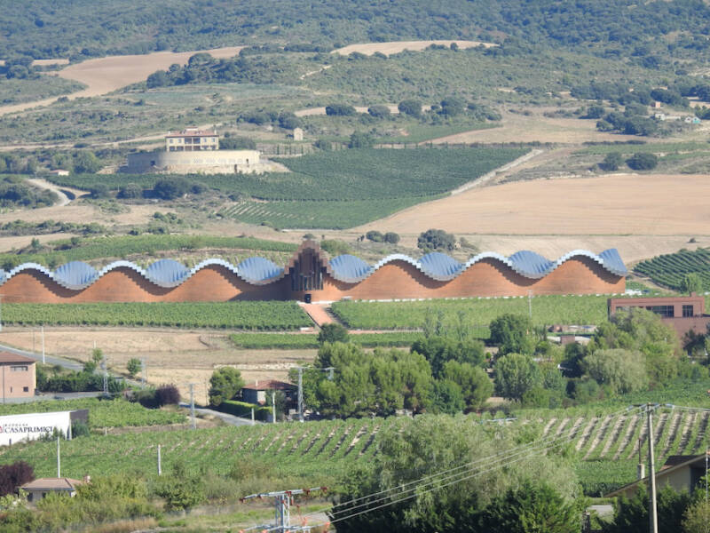 Gisteren een bijzonder ontwerp bij een wijn huis van Frank Gehry, bij Laguardia een wijnhuis van een Spaanse architect, het moeten wijnvaten verbeelden. Er is hout en staal gebruikt voor het dak