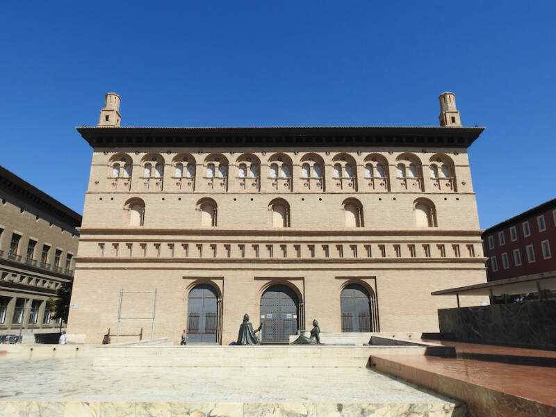Rechts het voormalige 16e eeuwse handelsgebouw La Lonja met aan de gevel de beeltenissen van de vorsten van Aragon