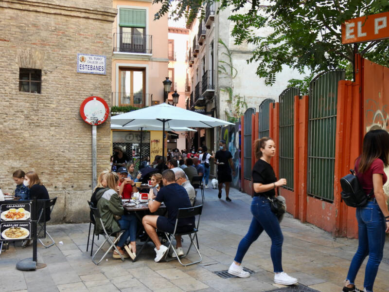We zijn de leuke wijk El Tubo ingewandeld met zijn nauwe straatjes , gezellige pleinen en vele terrasjes(en zijn vele tapasbars. Hier lopen ook wij met onze mondkapjes op, FFP2 maskers uit Duitsland, want je kunt gaan afstand houden, maar wat bruist het daar van leven. Het komt natuurlijk ook omdat het zondag is maar er moet altijd een leuke sfeer heersen.