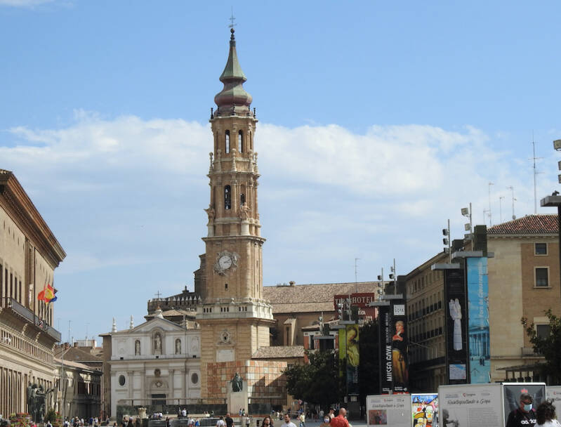 Veel Spanjaarden komen hier om de zuil te kussen waarop Maria was verschenen volgens de overlevering. Maar dat kussen is er niet bij in coronatijd. Fotograferen is binnen verboden maar wij hebben wel een paar foto’s gemaakt evenals vele anderen, maar het was donker in de kerk dus de foto’s zijn niet best. De schilderijen van Goya die er hangen waren helemaal te donker. Wel mooi zijn de fresco's die zijn aangebracht in de koepel o.a. van de hand van Goya. De kathedraal moet het echt van zijn imposante uiterlijk hebben wat ons betreft. Wat Goya betreft, op diverse plaatsen in de stad wordt er aandacht besteed aan zijn 275-tige geboortejaar.