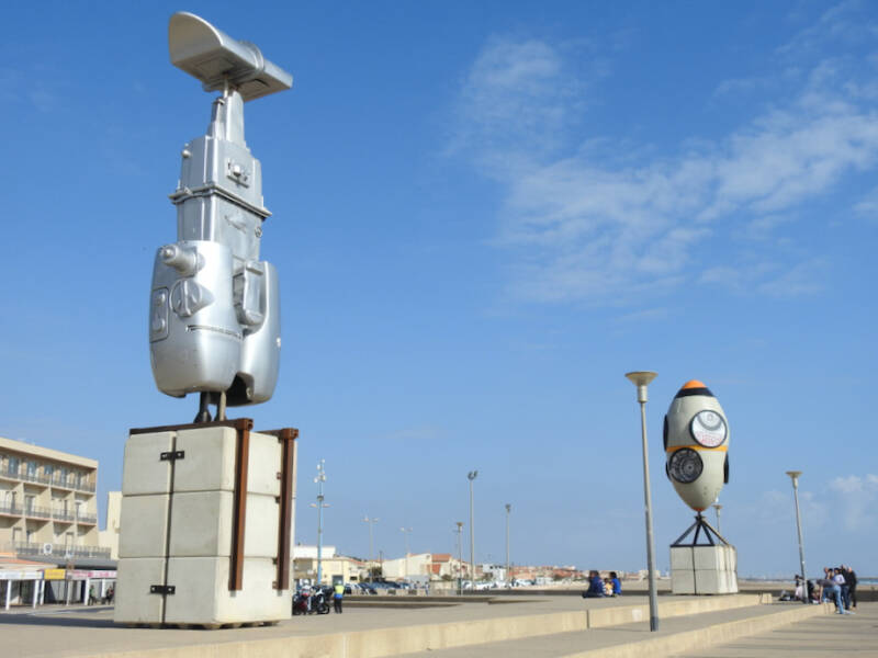 Kunst hoort te prikkelen, te verbazen, te verwonderen, geen idee wat dit voorstelt. Staat op de boulevard in Narbonne plage, geen info over de kunstenaar of het kunst werk. Totdat we een appje kregen van vriendin Christine dat het van de kunstenaar uit Narbonne Patrick Chaubert-Gaujal die hier op de boulevard een aantal objecten heeft geplaatst, allemaal samengesteld uit oude voorwerpen