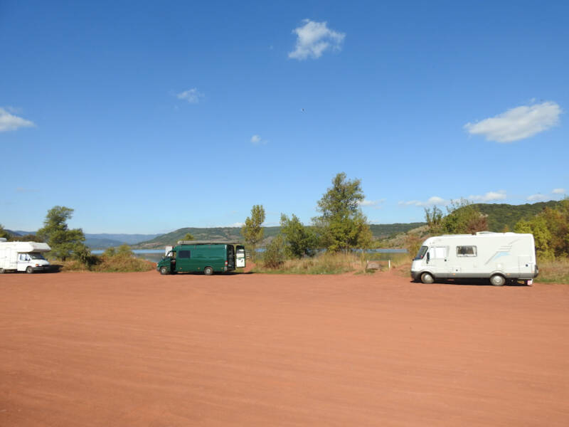 TomTom stuurde ons een weggetje op naar de A75 die langs de barrage zou gaan. Leuk, dat hebben we nog nooit gedaan, kijk daar staat een verbodsbord voor campers, caravans en bussen. Huh, bussen? Shit het is een inrijverbod en geen verbod om te kamperen! Toen was het te laat om te keren op het steeds smaller worden weggetje waar 3 tegenliggers met passen en meten konden passeren. De laatste 300m ( van de 7 km!) Was zo smal dat Everdien alleen recht voor zich uitkeek en ik zag dat we links een steile wand hadden en rechts een afgrond en de camper paste nog net op het zeer smalle asfalt. 20cm minder ruimte en het had heel vervelend kunnen afllopen, nu alleen het hart in de keel. En we namen ons ( opnieuw) voor als TomTom ons weer eens een alternatief weggetje wilde insturen, we dan eerst op de gedetailleerde Michelin kaart zouden kijken.