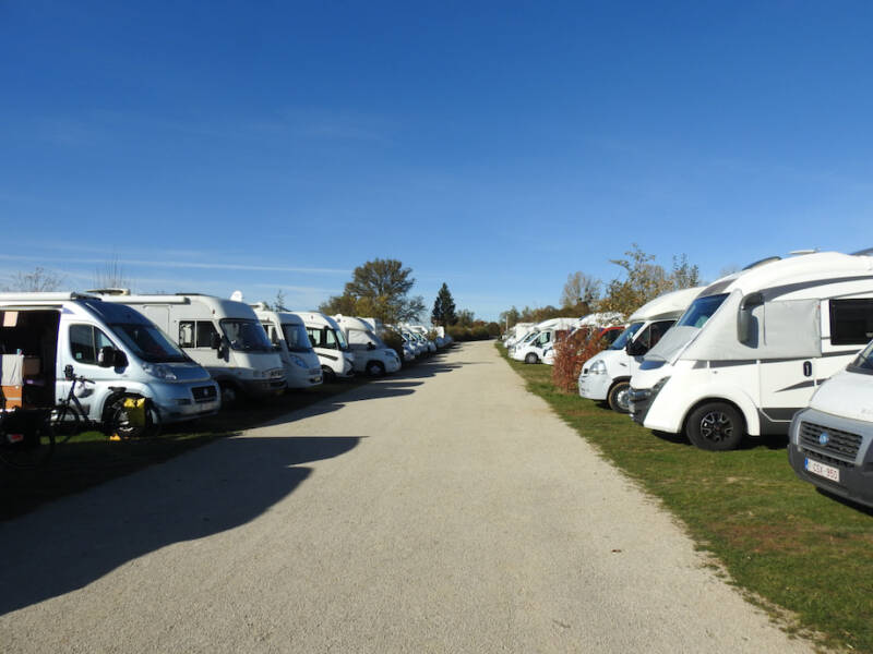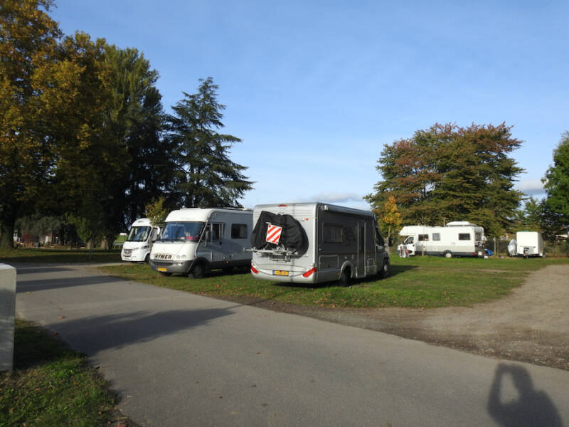 Dichterbij het meer reden we door kleine weggetjes en kwamen door leuke dorpen met veel vakwerkhuizen, het had nog een authentiek karakter daar. Bij de cp gekomen, er zijn er 3 rondom het meer, reden er nog 2 campers voor ons op, wij waren de laatste en het staat nu helemaal vol met 70 campers. Er konden er eerst 50 staan, de plaatsen aan de kant waar wij staan zijn kleiner gemaakt. Dat het zo druk is heeft voor een deel te maken met de herfstvakantie, er zijn hier dan ook tamelijk veel gezinnen met kinderen. En er rijdt een toeristentreintje rond over de dijk langs het meer.