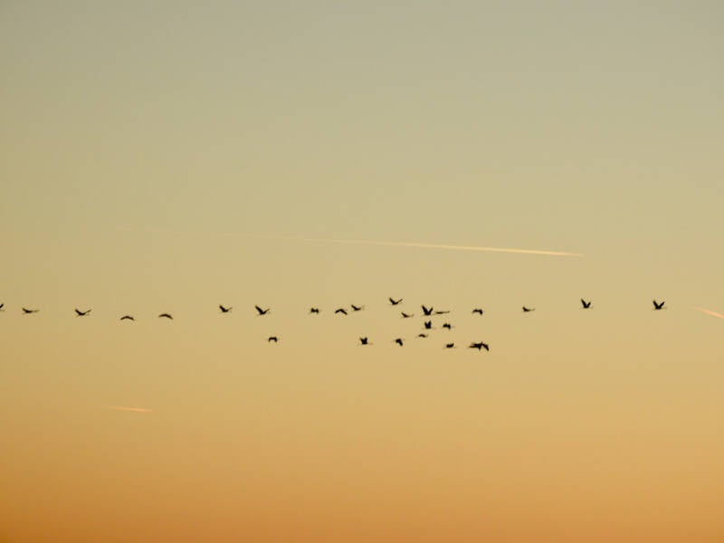 Tegen zonsopkomst vertrekken de eerste groepen kraanvogels op weg naar akkers om te foerageren, wel ver weg , het gaat om de herinnering aan dit prachtige schouwspel.
