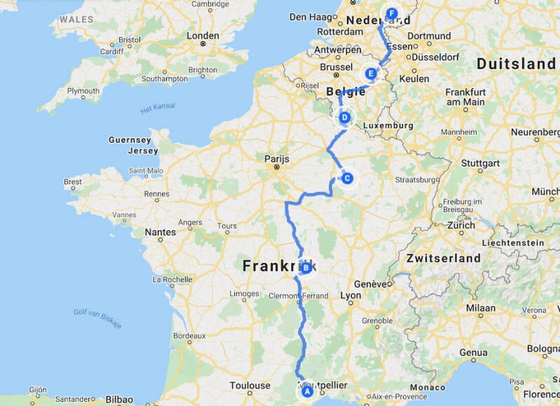 Morgen gaan we dan echt naar huis, nog zo’n 3 uur rijden over ruim 200 km. Nog even dit, heel toevallig, vlak voor we het stadje Bilzen binnen reden vloog er een groep van zo'n 50 kraanvogels over op weg naar Lac du Der.