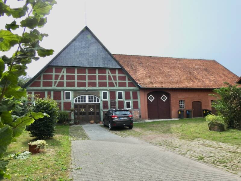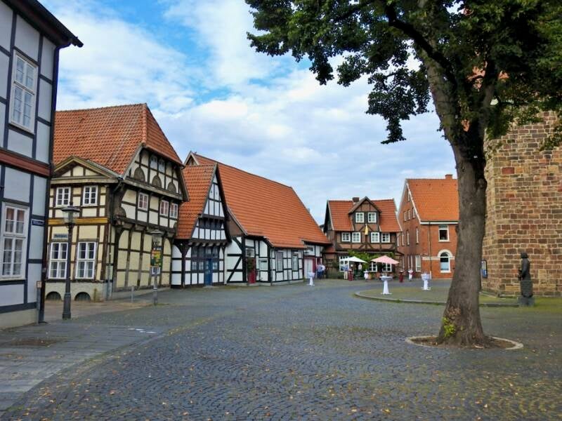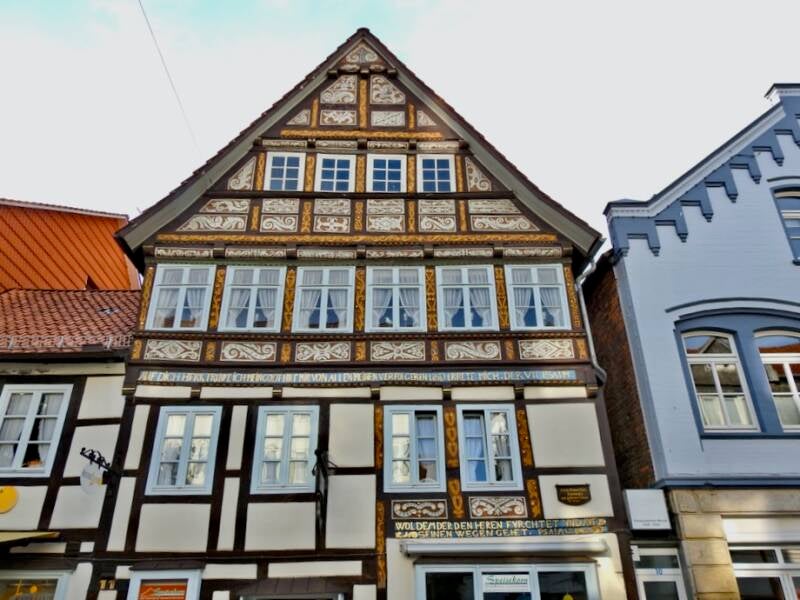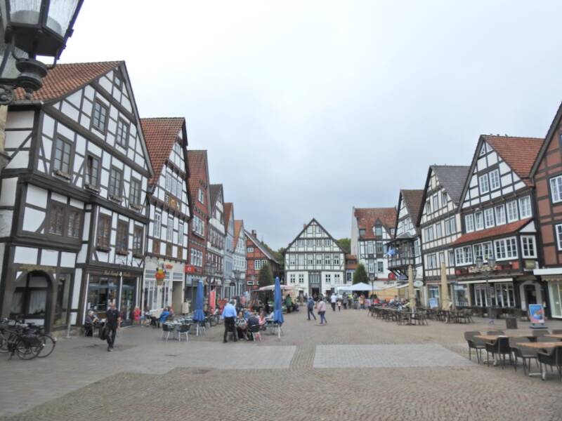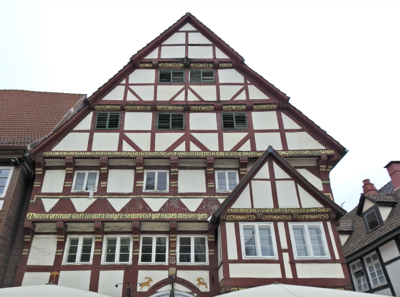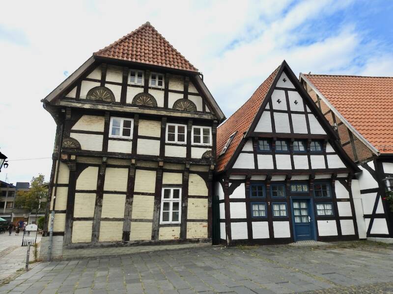 Aan het eind van de ochtend zijn we het stadje ingelopen wat een alleraardigst oud centrum heeft met veel vakwerkhuizen. Mooie exemplaren staan er aan de Marktplatz, dit zijn voormalige huizen van rijke kooplieden uit de 16e eeuw. De vakwerkhuizen hebben veel bontgekleurd houtsnijwerk aan de gevels. Je ziet aan de huizen dat de kooplieden goed geld verdienden aan de handel in de 16e eeuw met de stad Bremen en Holland. Uitgevoerd werden granen , leer, steenkool en ijzer, ingevoerd uit Skandinivië o.a. vis, olie, traan en boter.