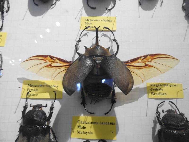 Dus kwam het goed uit dat we een vlinderfarm en insectenmuseum ontdekten. Er was een ruimte waar vlindersoorten uit de hele wereld, vooral uit tropische gebieden waren opgeprikt. Dat niet alleen, ook allerlei soorten insecten zoals sprinkhanen, grote torren, kevers, mieren etc. Er stonden verschillende terraria met vogelspinnen, schorpioenen en vreemdsoortige insecten die als voedsel voor de vogelspinnen dienden.