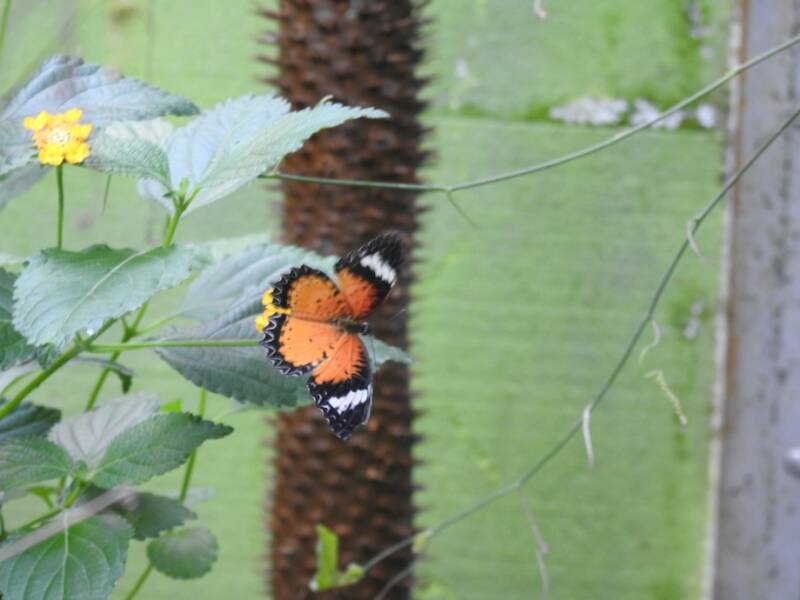 Het mooist was de tropische vlindertuin waar allerlei soorten vlinders in een warme, vochtige omgeving rond fladderden. Er was een ‘poppenkraamkamer’ en vlinders gingen soms op je haar zitten, zoals bij Everdien die dat minder leuk vond voelen dat gefladder. We hebben daar een tijdje rondgewandeld en gefotografeerd, de lens besloeg telkens door de vochtige warmte ( 30º, luchtvochtigheid 90º) maar er zijn toch wel foto’s gelukt. Heel leuk trouwens om daar rond te wandelen.