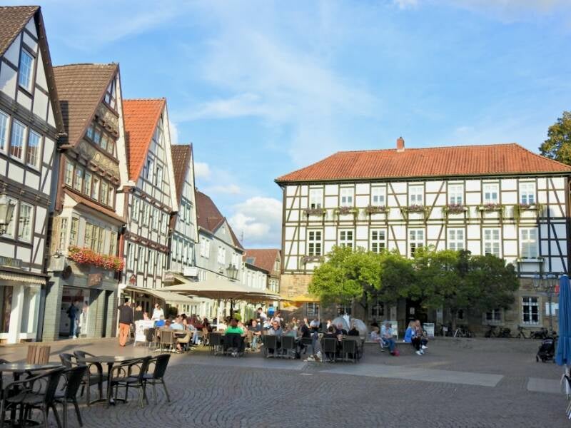 Hameln wordt tot de mooiste stadjes van Duitsland gerekend vanwege de vele vakwerkhuizen uit de 16e tot 18e eeuw die in de Altstad staan. En Hameln is natuurlijk bekend om de ‘rattenvanger van Hamelen’, het bekende sprookje die natuurlijk hier toeristisch wordt uitgebuit. De voor zijn werk niet betaalde rattenvanger die als wraak met zijn fluitspel 130 kinderen meelokte en die nooit meer zijn teruggekomen. Althans volgens het sprookje van de Gebr. Grimm.