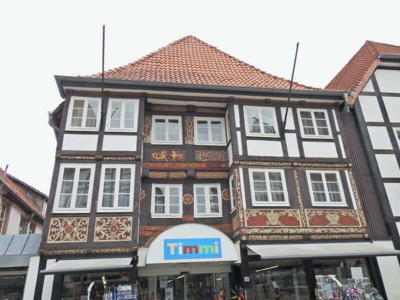 Nu wordt er in een stad zoals bv Hameln natuurlijk geleefd dus ook gewinkeld. De benedenverdieping van fraaie huizen bestaat vaak uit winkels met glazen puien, het is per slot van rekening geen open-lucht-museum. Maar dat zoiets als op bovenstaande foto wordt toegestaan, Timmi in afschuwelijk blauw waardoor een deel van het schilderwerk en de tekst verloren gaat, onbegrijpelijk.