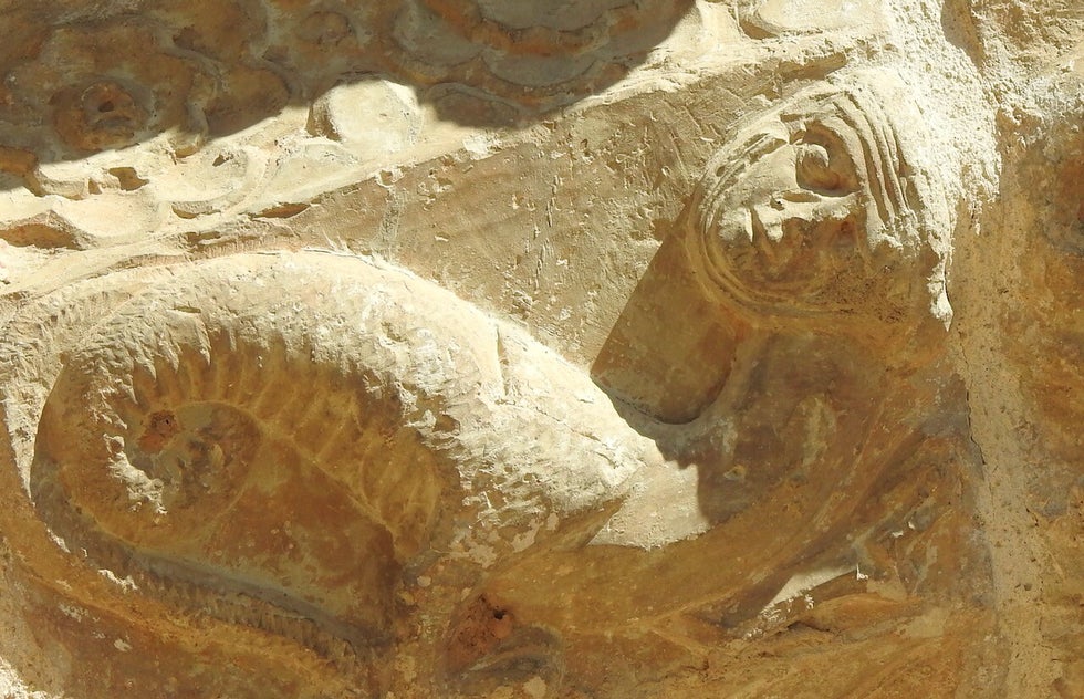 Boven het portaal van het Romaanse kerkje, een dier met het hoofd van een mens.