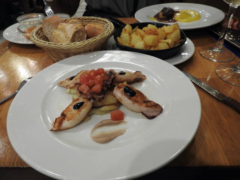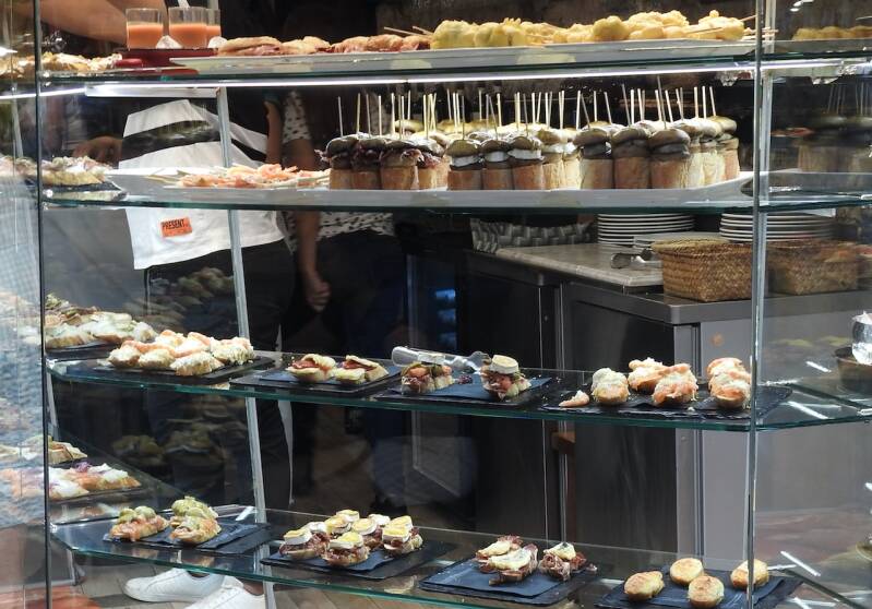 We hadden ondertussen wel trek gekregen, zeker toen we de talloze pintxo bars passeerden, het lijkt wel of heel Spanje eet. Voor de populairste restaurants stonden rijen mensen te wachten tot ze naar binnen konden, wij hadden geluk dat er een tafeltje vrij kwam zodat we konden zitten, Spanjaarden staan veelal aan tafeltjes buiten. We hebben erg lekkere pintxos gehad, o.a. biologische foie gras ( licht gebakken) met mangodressing en inktvis met kastanjedressing op een bedje van dunne gebakken aardappelschijfjes en gekarameliseerde uitjes.