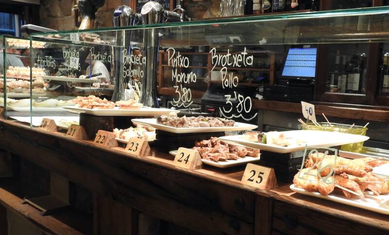 De lekkerste pintxos die we tot nu toe hebben gegeten, oa biologische foie gras met mango dressing en inktvis met kastanje dressing