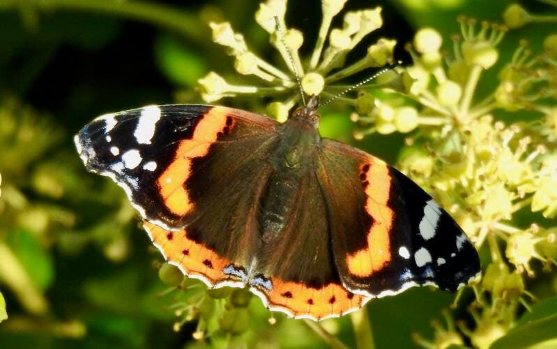 Naast de camper in de Kleine Klimop veel insecten en ook deze vlinder, de Atalanta. het is een trekvlinder die ook wel overwintert in België en Nederland. Liet zich zien door het zonnige weer.