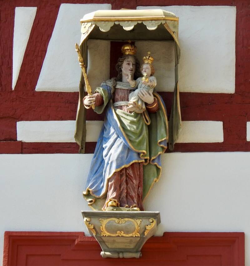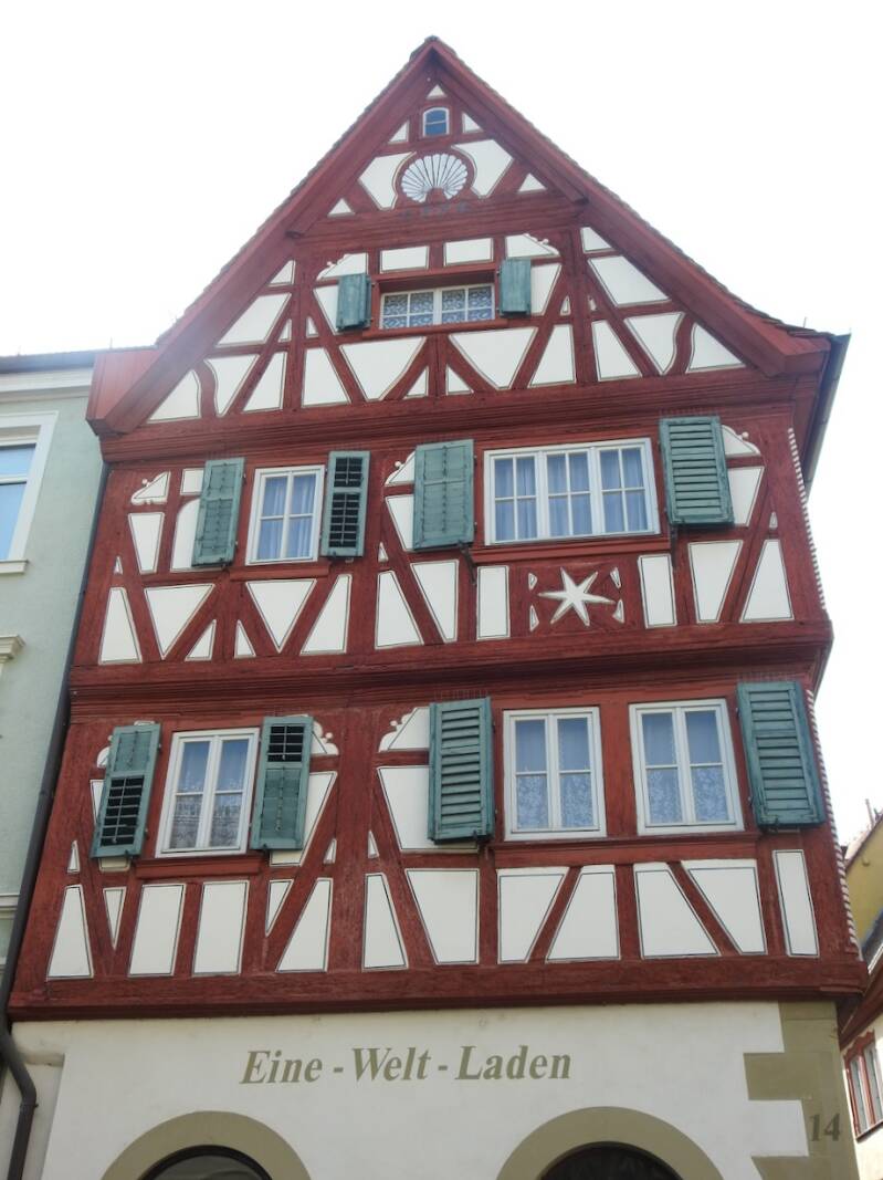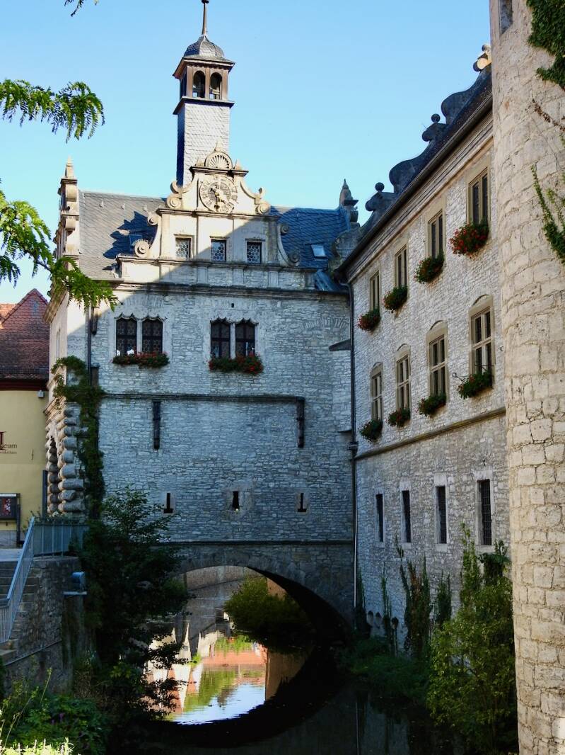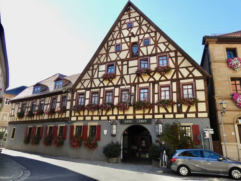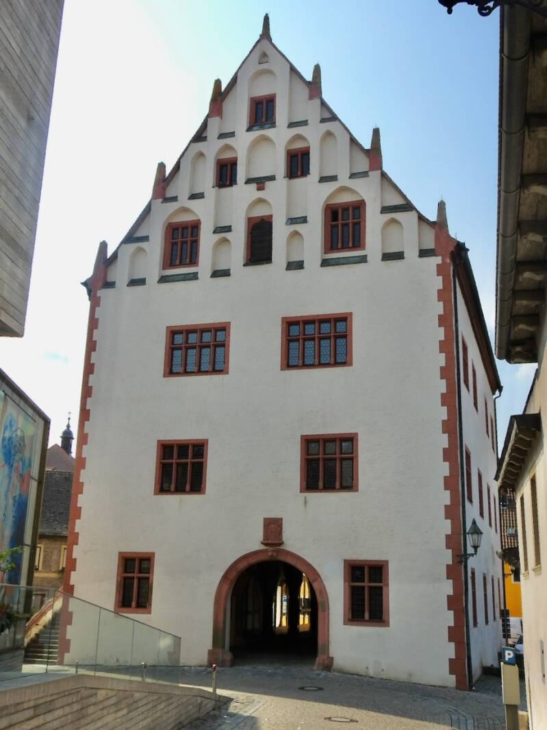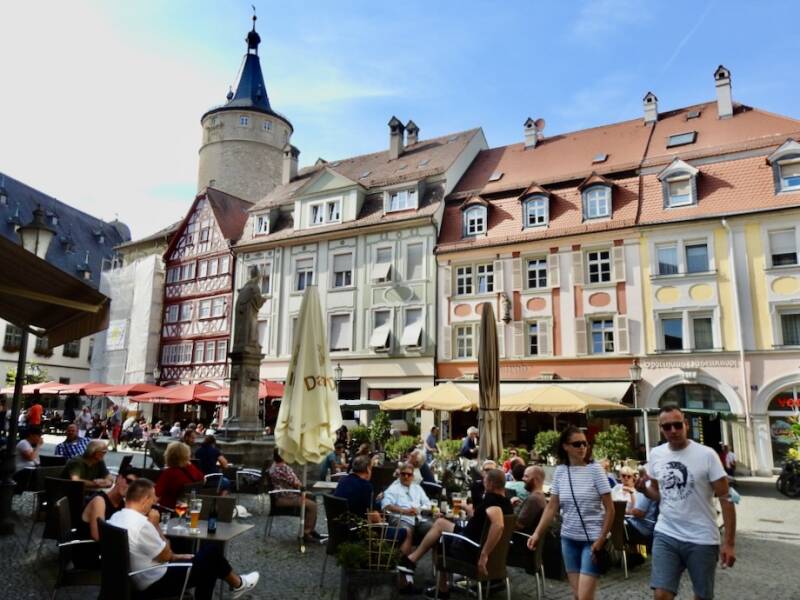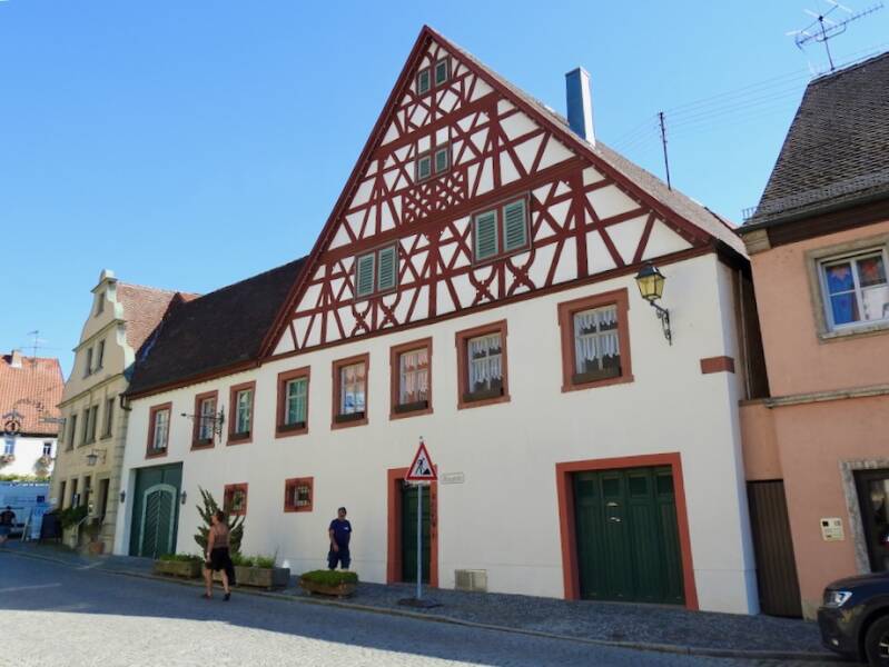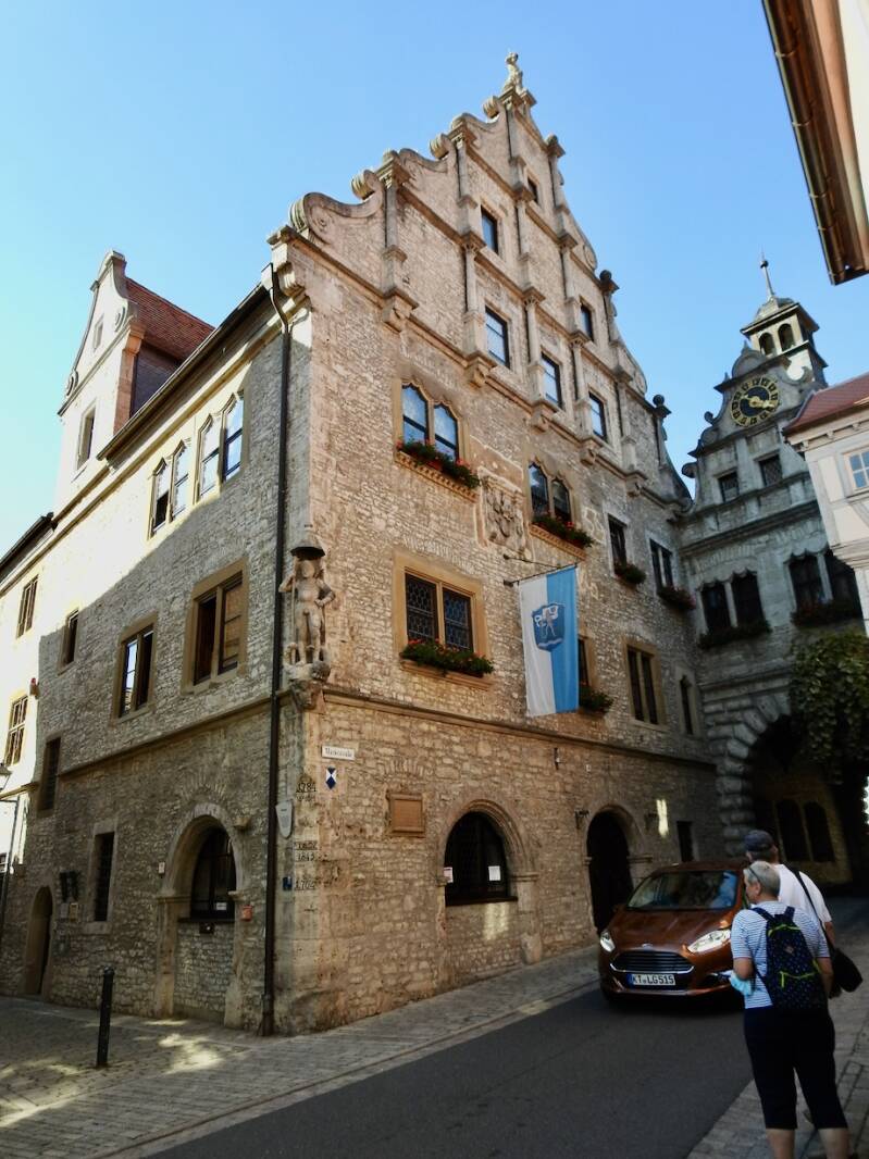 Kitzingen zou je eerder een stadje dan een dorp kunnen noemen, het centrum straalde dat ook uit met een voetgangersgebied met winkelstraten met aardige winkels. Het is een stad dat het nog meer van de wijn dan van de toeristen moet hebben. En het wordt ook niet zo gedomineerd door alleen maar vakwerkhuizen hoewel we die ook wel hebben weten te waarderen. Zo staan er middeleeuwse gebouwen en torens en is het raadhuis gebouwd in renaissance stijl. En we ontdekten een huis met Jugendstil-elementen. Ook hier net als gisteren wel aardig wat mensen op de been maar niet te druk.