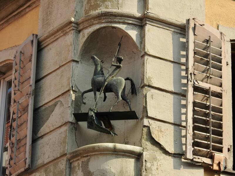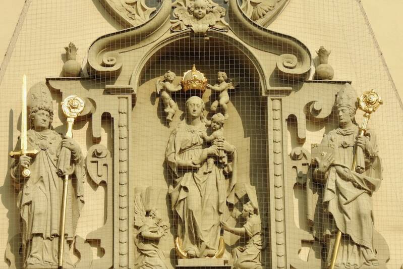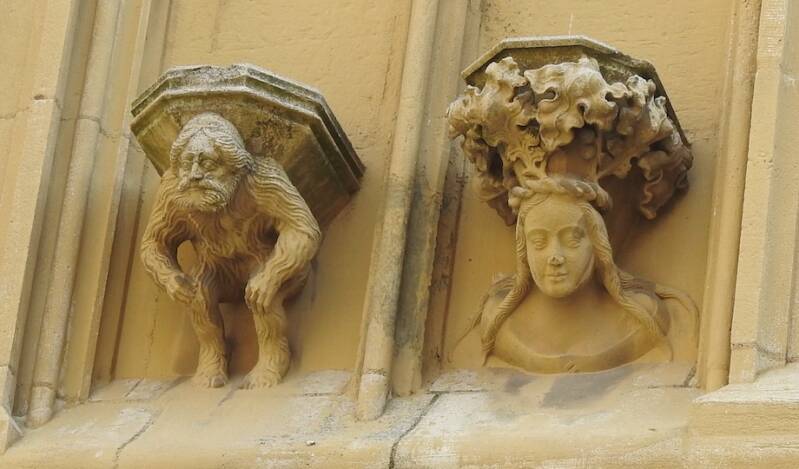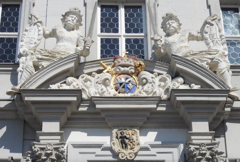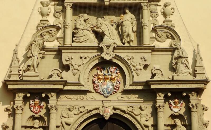 Beelden boven de ingang van het Rathaus, zij vellen een moreel oordeel..