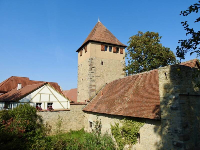 De westkant van Die Altstadt van Ochsenfurt. Met 2 torens van de vestingmuur, de Klingentorturm en de de achterste is de Nikolausturm.