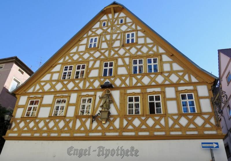 Ochsenfurt is een oud dorp die ooit helemaal ommurend geweest. Je ziet nog gedeelten van de vestingmuur wen er zijn ook nog een paar torens over. Verder zijn er goed bewaarde middeleeuwse vakwerkhuizen en zit er een bijzonder uurwerk op het Rathaus. Ook is er nog een klein slot. Veel winkels zijn er niet in de Hauptstrasse, merkwaardig genoeg wel 3 apotheken vlak bij elkaar. Het centrum is klein maar doet leuk aan, weer eens wat anders dan het drukke Wúrzburg, blij dat we deze veilige keuze hebben gemaakt.