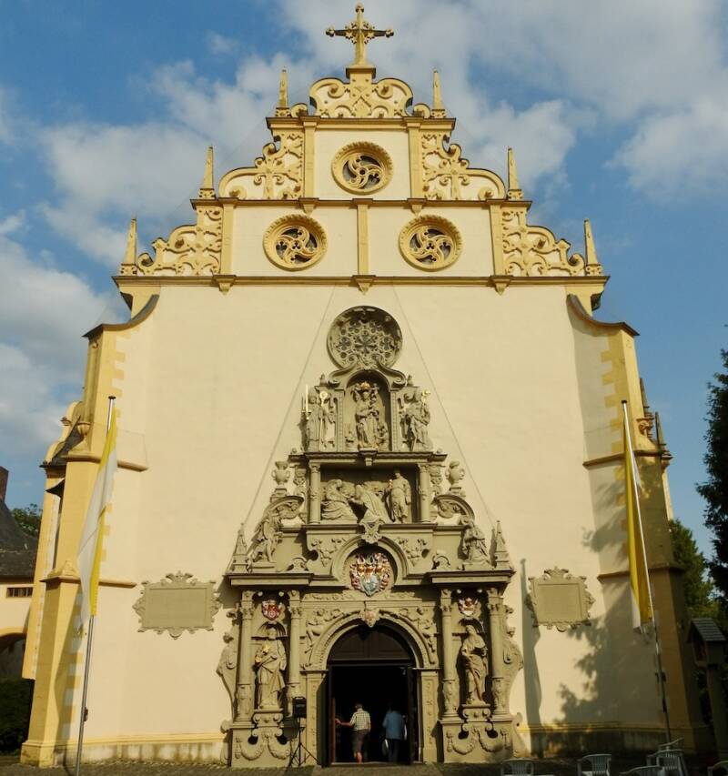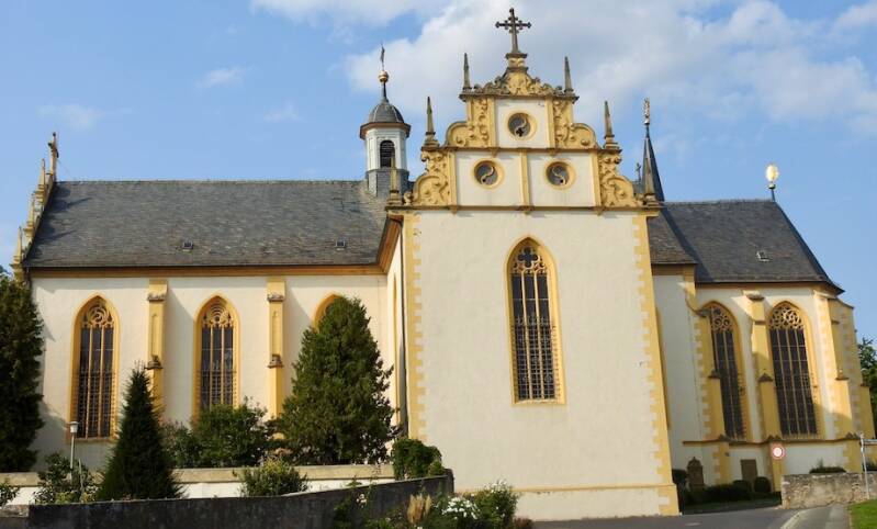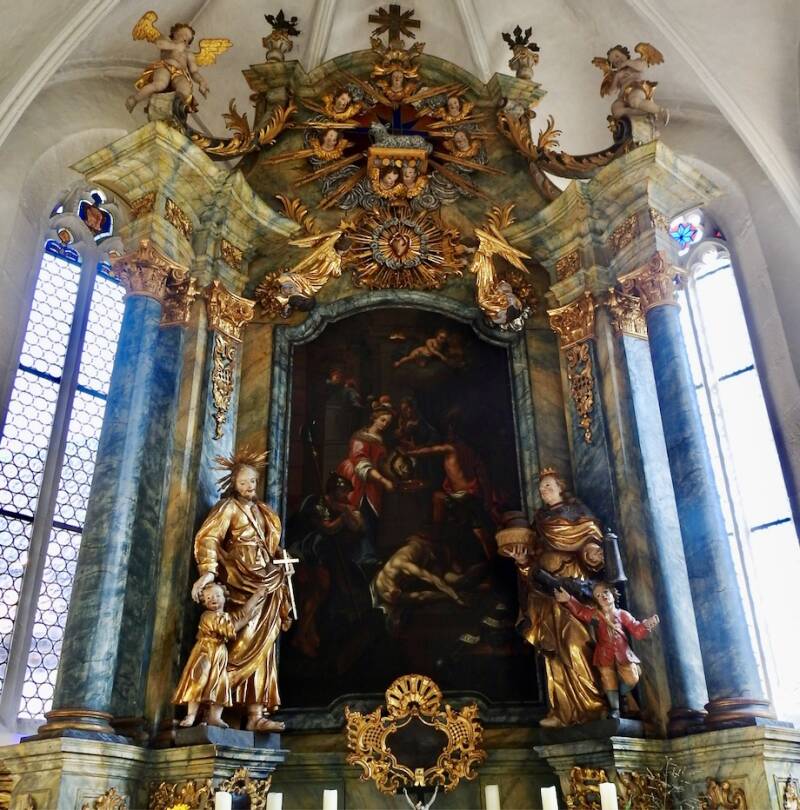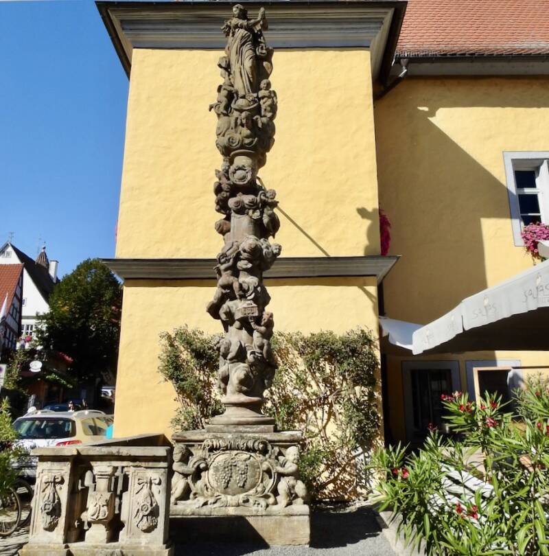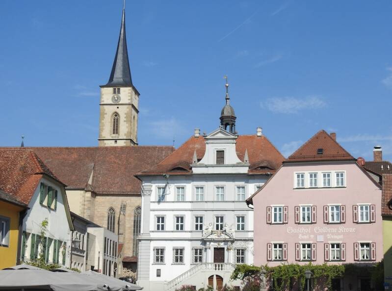 Iphofen heeft een mooi marktplein met oude adelsresidenties en een barok Rathaus. Vlak daarachter ligt de Spitalkirche, daar zijn we in geweest. Het heeft een mooi retabel en een fraaie preekstoel, ook 2 schilderijen aan weerskanten met schilderijen versierd met beelden.
