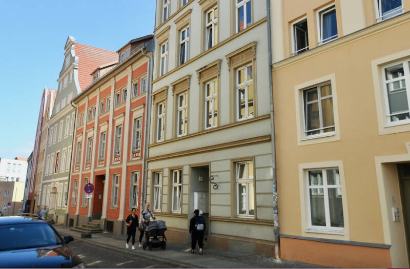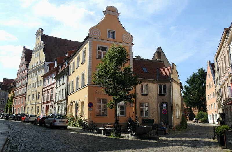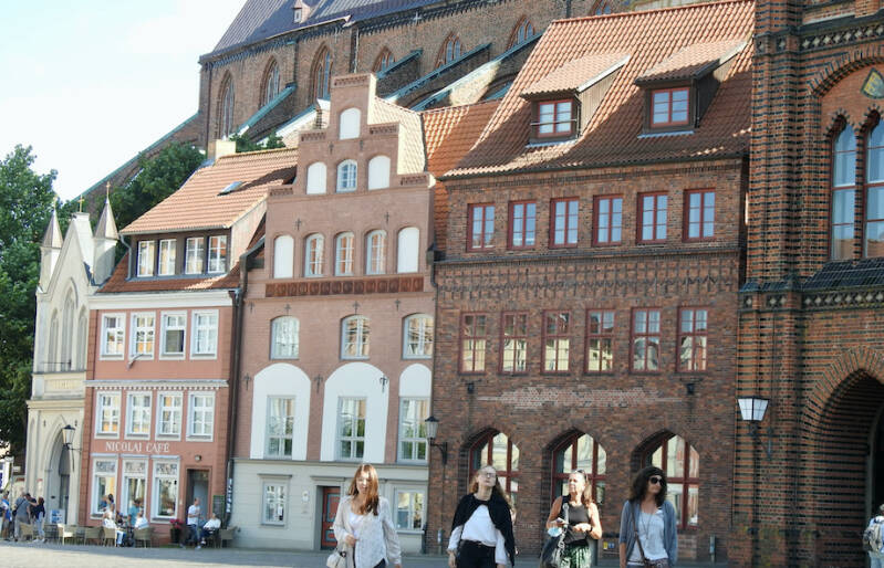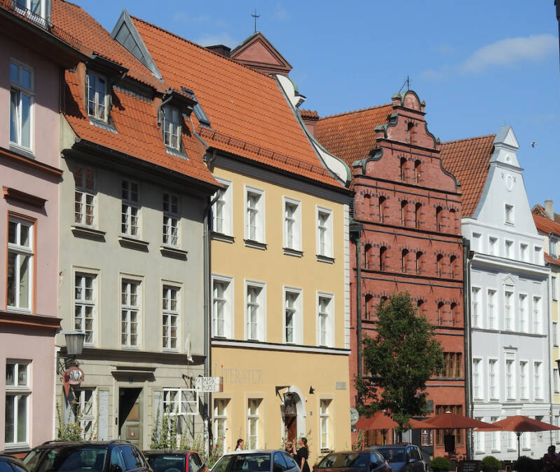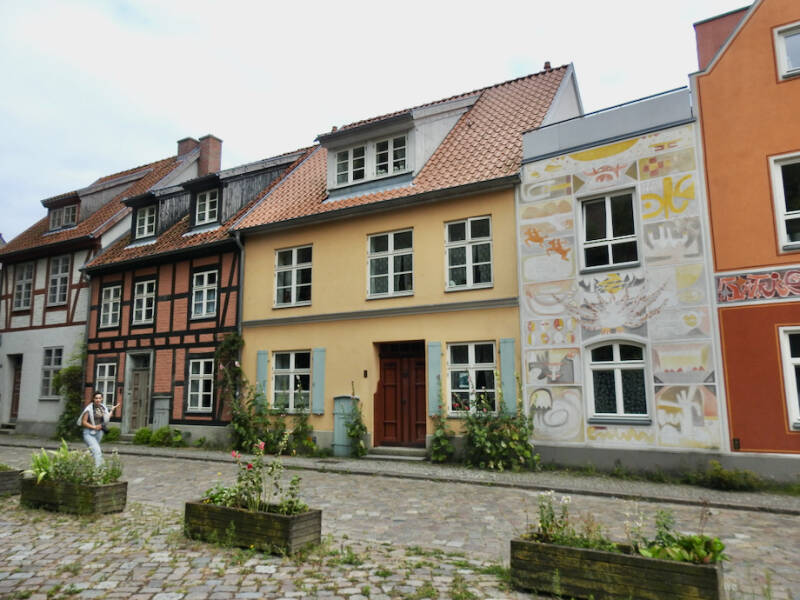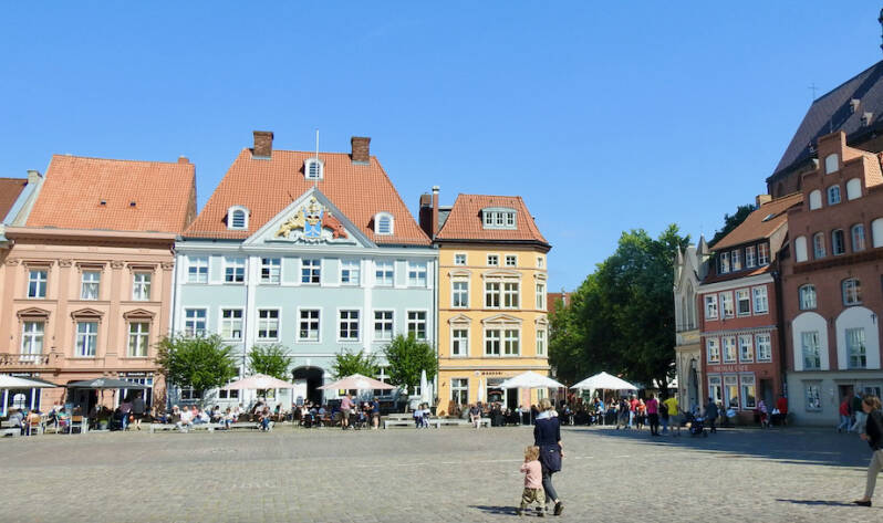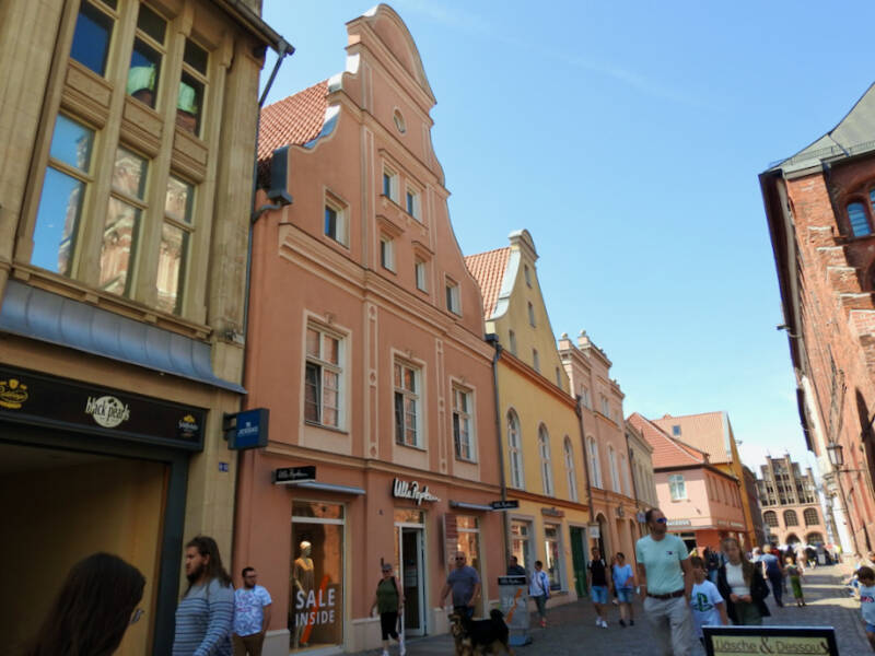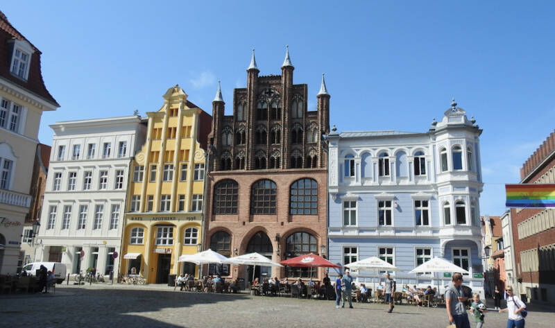 Daar zijn al veel bezienswaardigheden waaronder het bijzondere Rathaus ( 13e eeuw) met zijn 6 torentjes. Daar linksachter staat de St Michael kerk. Onder het raadhuis door zijn zuilengangen waar je doorheen kunt lopen. Rondom het plein staan diverse historische panden zoals het gotische Wulflamhaus en het barokke hoofdkwartier van de Zweedse commandant. De Altstad is heel prettig om doorheen te slenteren, je ziet overal huizen met mooie gevels, natuurlijk is hier net als in Wismar ook de baksteengotiek prominent aanwezig. Leuk zijn de diverse kleuren van de huizen, zoals diverse pastel-en aardetinten maar ook mintgroen, heel goed op elkaar afgestemd. Ook de (ver)nieuwbouw in sommige aanloopstaten zijn in passende kleuren opgeknapt.