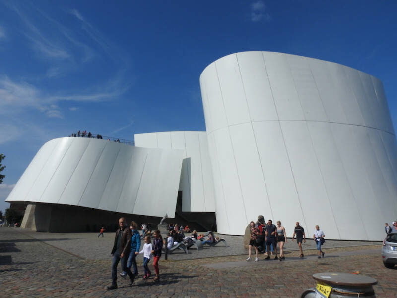 Het Ozeaneum, moderne architectuur tussen de baksteengotiek langs de havenkade, wij vinden het een mooi contrast.