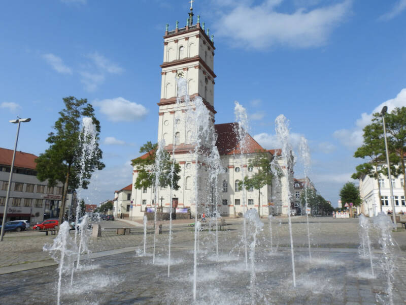 De Stadtkirche 1778, de toren werd er in 1831 bijgebouwd. Op de voorgrond het waterspel en aan weerskanten van de kerk 2 van de 8 wegen.