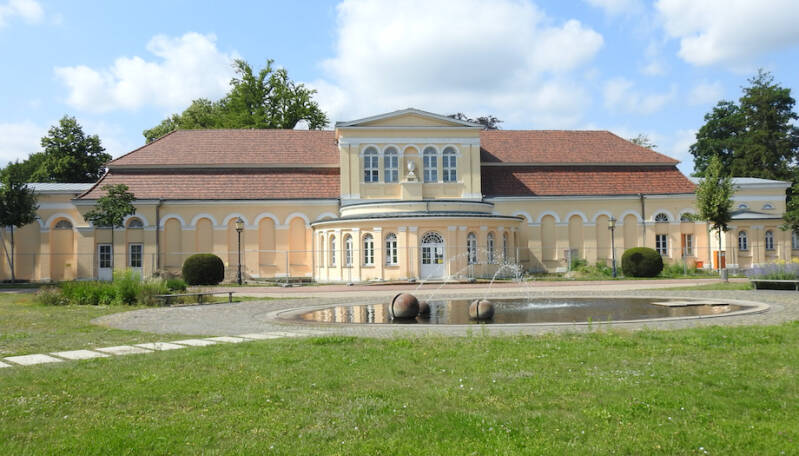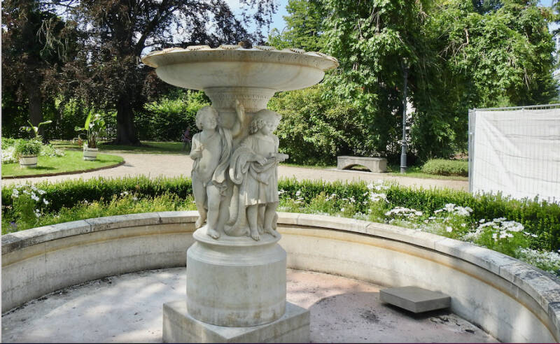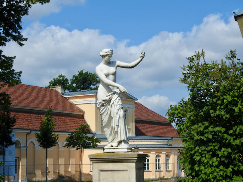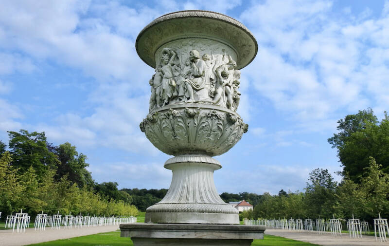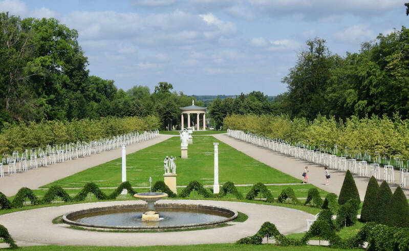 Een deel van de Schlossgarten met op de achtergrond een tempel, de Hebetempel