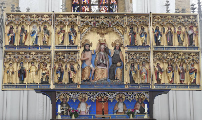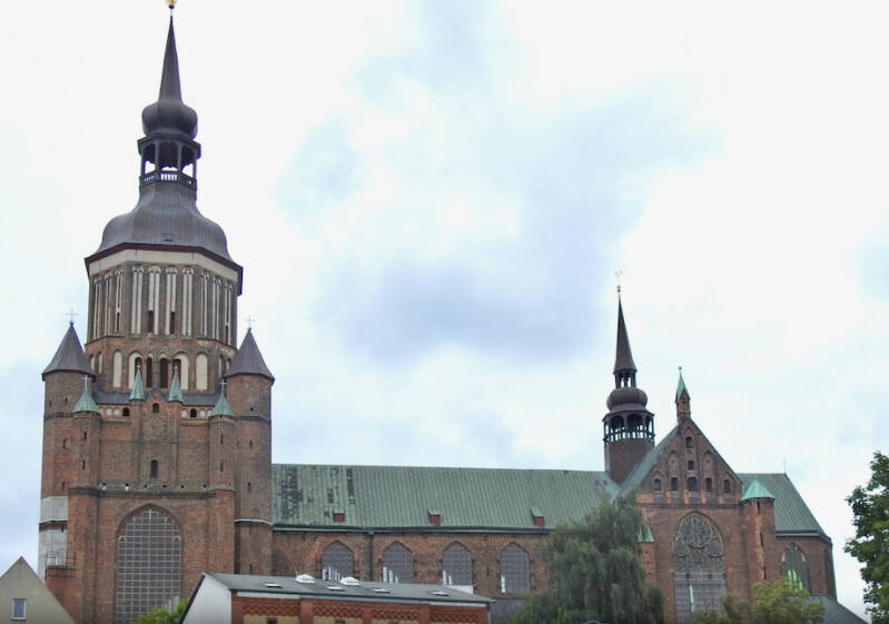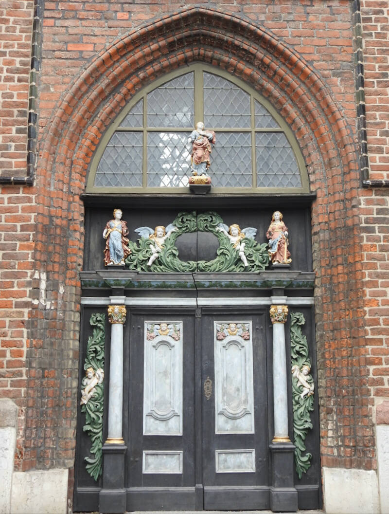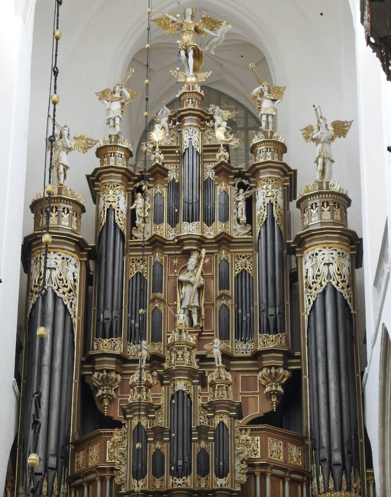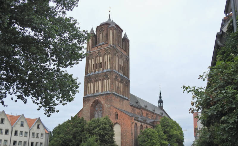 We zijn vanmiddag weer de stad in geweest , allereerst zijn we naar de Mariënkirche geweest. Deze kerk met 8-kantige toren stamt uit de 14e eeuw en geldt als een schoolvoorbeeld van laat Noord Duitse baksteengotiek. De toren was ooit het hoogste gebouw ter wereld, in de 16e en 17e eeuw met een hoogte van 151 m. De toren is door de bliksem getroffen in 1647 en herbouwd met de huidige barokke koepel en is nu 104m, hoog. De Het interieur is niet heel bijzonder maar wel een kort bezoek waard. Het bevat een mooi orgel uit 1659 en een beschilderd retabel van hout , de kroning van Maria, uit 1440.