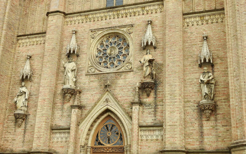 Boven het hoofdportaal zie je de beelden van de 4 evangelisten. In de kerk vinden tentoonstellingen plaats van hedendaagse kunstenaars.