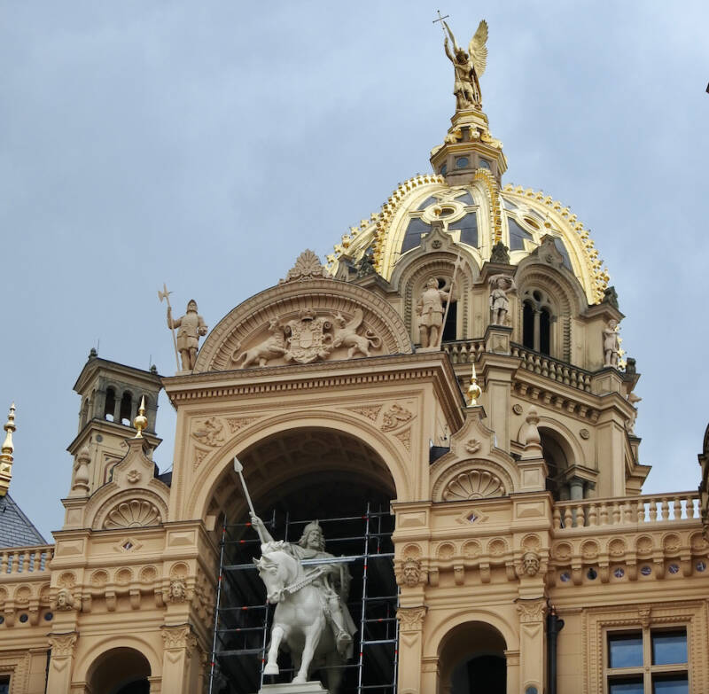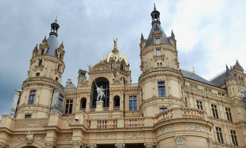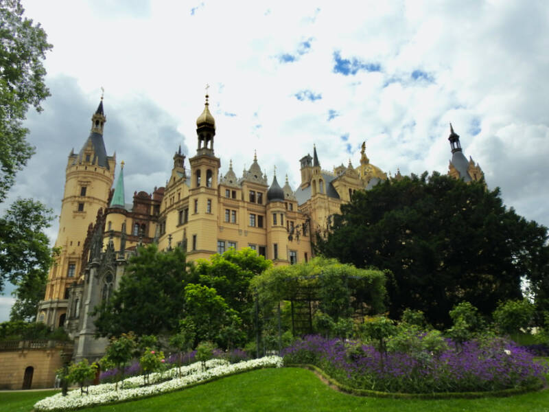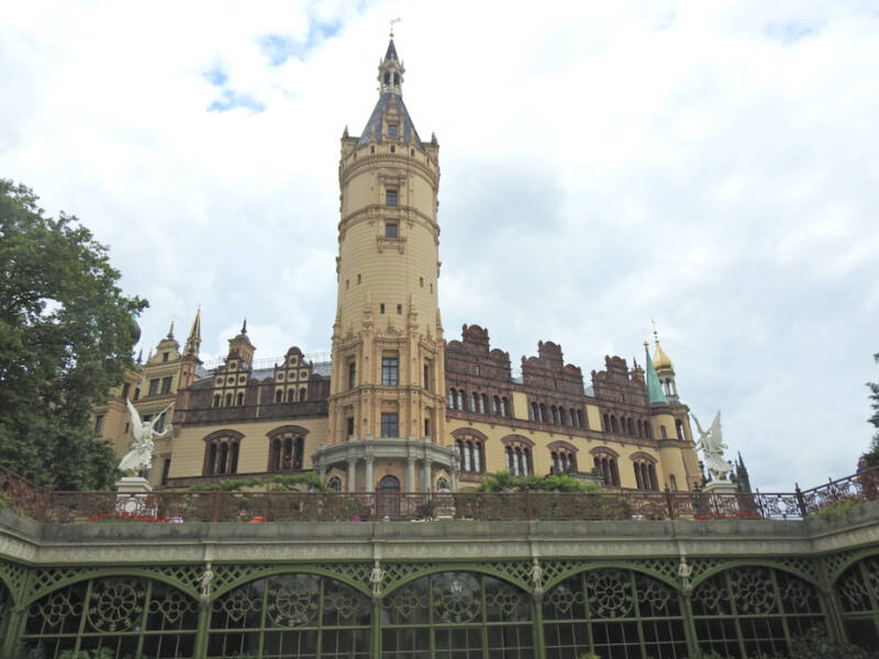 We zijn aan het begin van de middag naar het slot gefietst ( ja, het kon!) waar Schwerin beroemd om is. Het was jammer dat er donkere dreigende wolkenvelden overtrokken waardoor het slot wat somber oogde. Het slot met zijn torentjes is door de bouwer geïnspireerd op het kasteel van Chambord en doet wat bombastisch maar gelukkig ook wat sprookjesachtig aan. We hebben eerst door een groot park gefietst en we besloten al snel om niet naar binnen te gaan , een wel erg lange rij wachtenden was ons te veel, zeker als je je door slaapgebrek niet fit voelt.
