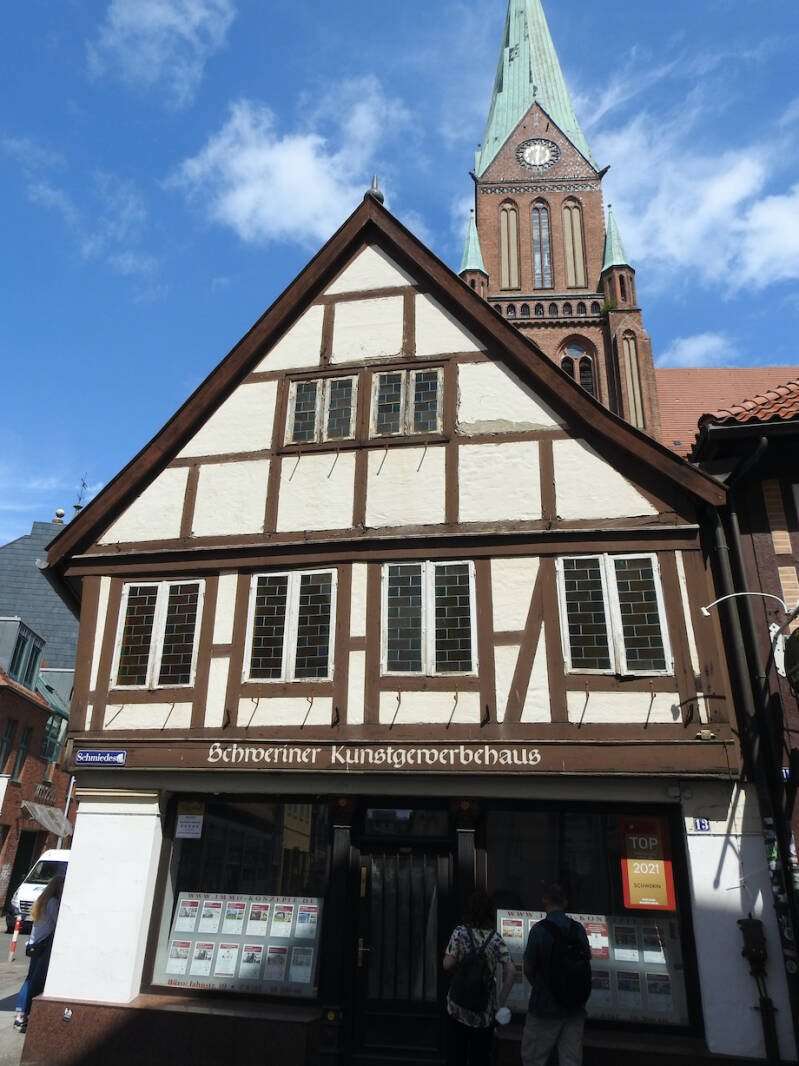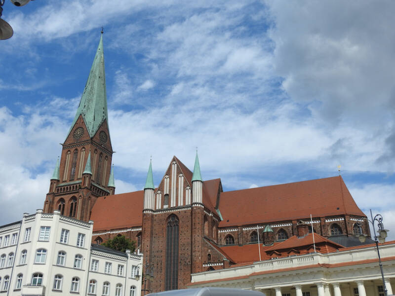 We zijn aan het eind van de ochtend weer naar de stad gefietst, dit keer naar het historisch centrum, die Altstadt. Hoewel Schwerin niet veel te lijden heeft gehad van de 2e WO, staan er niet veel echte monumenten. Wel wat aardige gebouwen en huisjes en natuurlijk de Dom van Schwerin. Deze kathedraal wordt , ondanks het feit dat de toren neogotisch is, beschouwd als het voorbeeld van de gotische baksteenarchitectuur in het Oostzeegebied . De toren kan beklommen worden, dat hebben we niet gedaan. Wel hebben we het interieur bezichtigd, die was best aardig maar als je de katholieke kerken in Zuid Europa gezien hebt met zijn pracht en praal, dan is dit wat sobertjes.