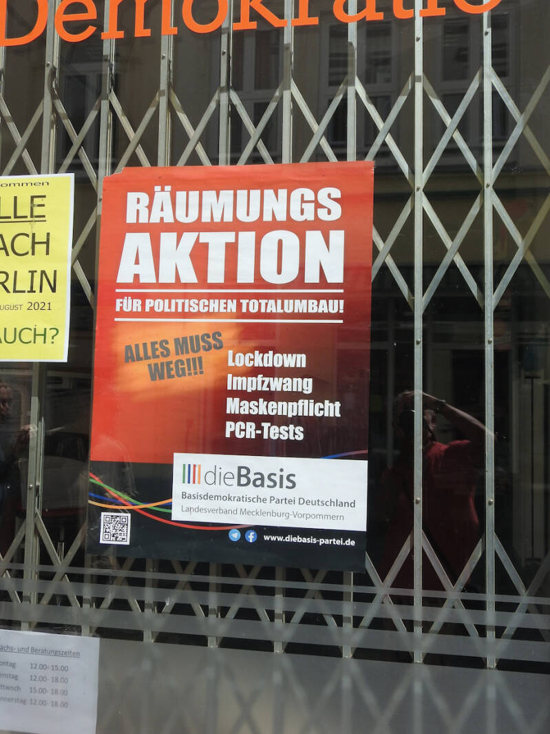 In de stad zagen we een affiche hangen van Queerdenkers, anti-coronamaatregelen activisten zoals bij ons Viruswaarheid en anderen onfrisse clubjes. Dit affiche was van de Basisdemokratische Partij Deutschland, het bleek op het partijbureau te hangen, de naam roept associaties op aan idealistische linkse bewegingen. Maar niets is minder waar, hoewel de oprichters van de partij, juli 2020 en 30.000 leden, beweren dat ze noch links noch rechts zijn en er uit andere partijen afkomstige leden zich aansloten( zoals van de Groenen , ws omdat er in het begin meer esoterische dan politieke uitspraken werden gedaan), zijn ze in de praktijk de extreemrechtse richting opgeschoven. Steeds meer aanhangers van complottheorieën zijn tot de partij toegetreden evenals mensen uit de antroposofische hoek die van oudsher anti-vaxers zijn.* Kwalijker is dat hun Bondsdag kandidaat, de arts Bakhdi in een videoboodschap antisemitische uitingen heeft gedaan en de partij hier geen afstand van neemt. Reiner Fuellmich, een andere Bondsdagkandidaat van de partij, relativeerde de Holocaust door te zeggen dat de federale regering “slechter” is omdat ze “een soort concentratiekamp” wil opzetten voor degenen die niet zijn gevaccineerd. 1 augustus is er weer een anti coroanamaatregelen demo in Berlijn, extreemrechts zal weer prominent aanwezig zijn.
