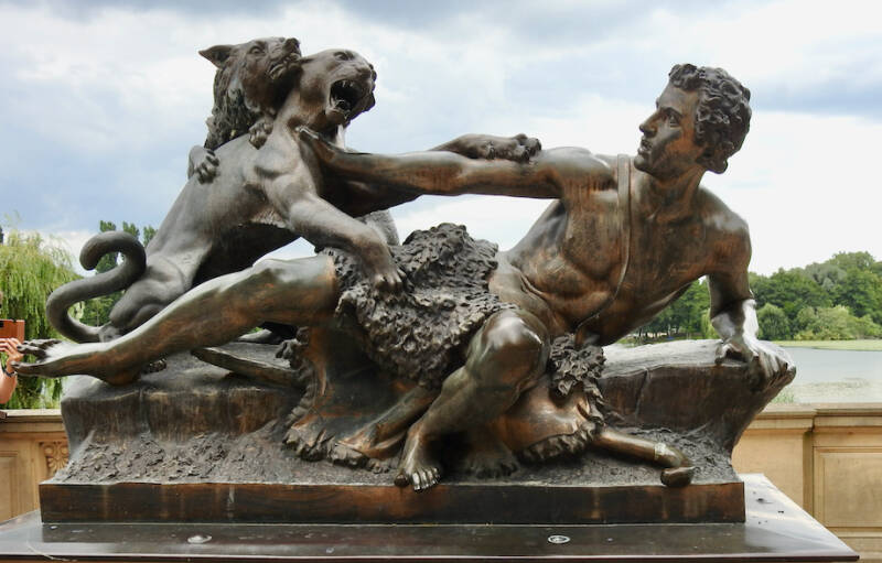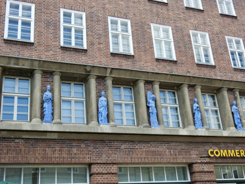 Enigszins vervreemdend deze blauwe, nep klassiek beelden op een bankgebouw in de winkelstraat van Schwerin