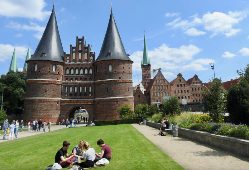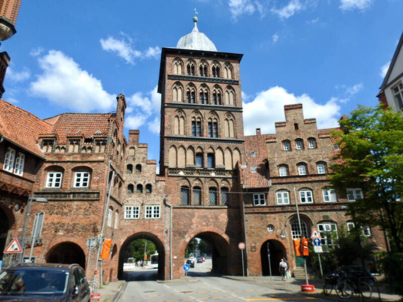 Een eindje verder, met in zijstraten weer huizen in baksteenarchitectuur, zijn we naar de Holstentor (1466-1478) gewandeld, ooit de enige toegangspoort tot de stad. Daarachter ligt een park waar we even op een bankje hebben gezeten, kijkend naar niet alleen de poort maar ook naar de toeristen die selfies maakten.